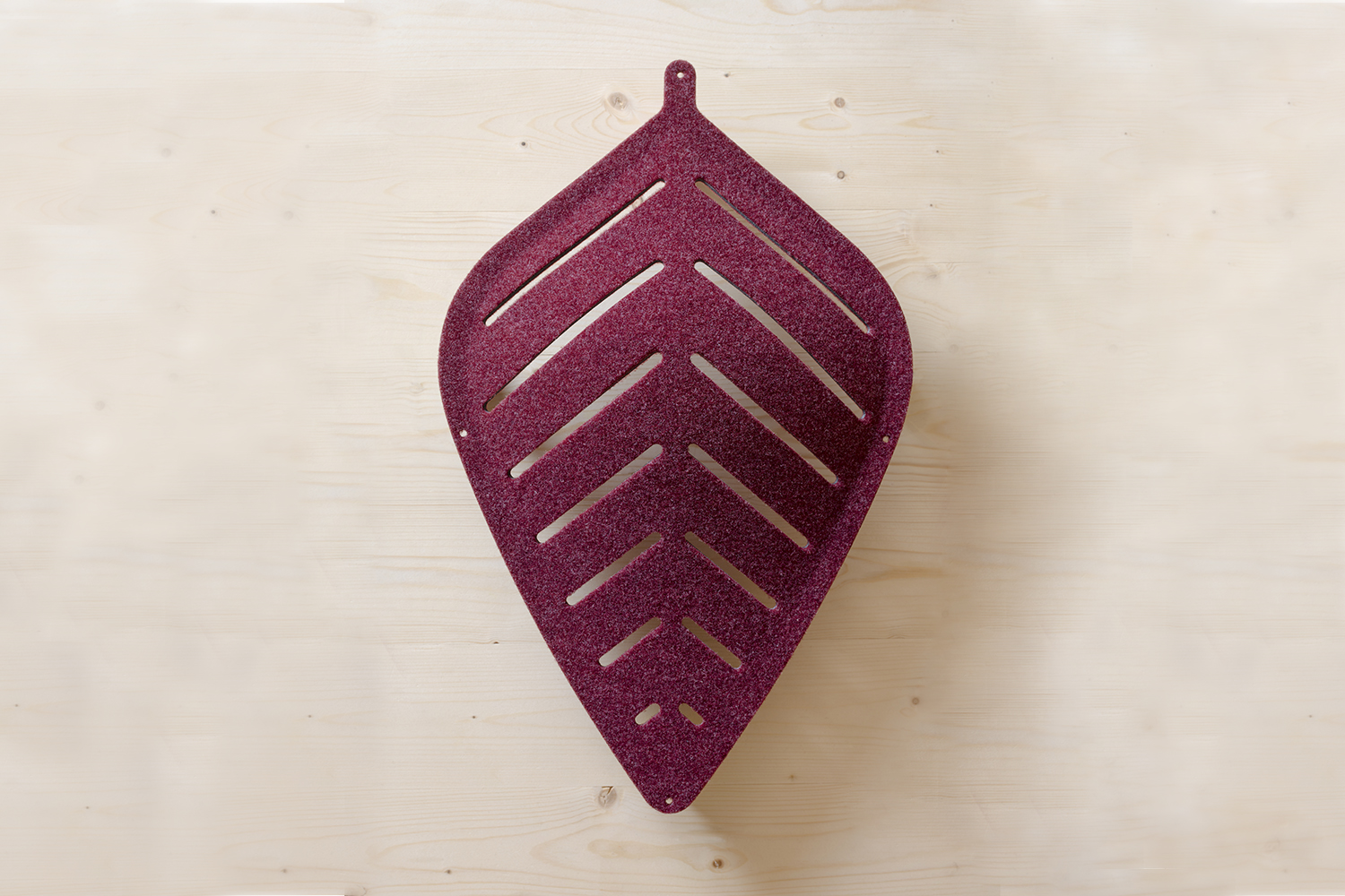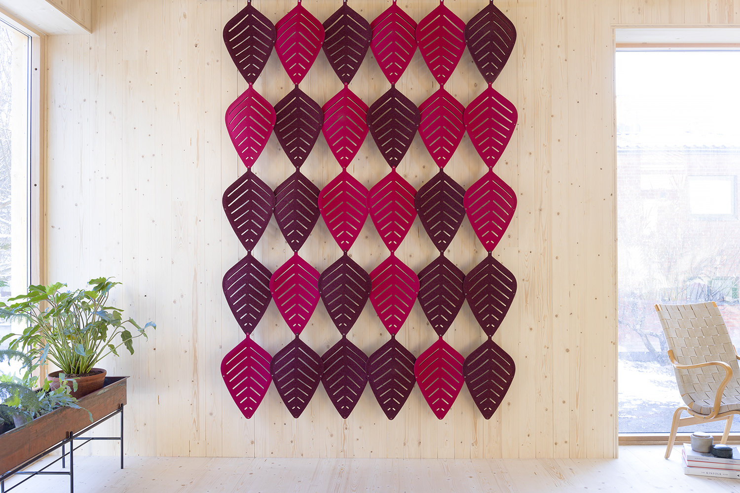 Les modules Airleaf sont fabriqués à partir de feutre compressé recouvert de tissu. Ils s’assemblent à l’aide de petites attaches en plastique. L’ensemble se monte sur un rail en aluminium qui peut être fixé au mur ou au plafond.