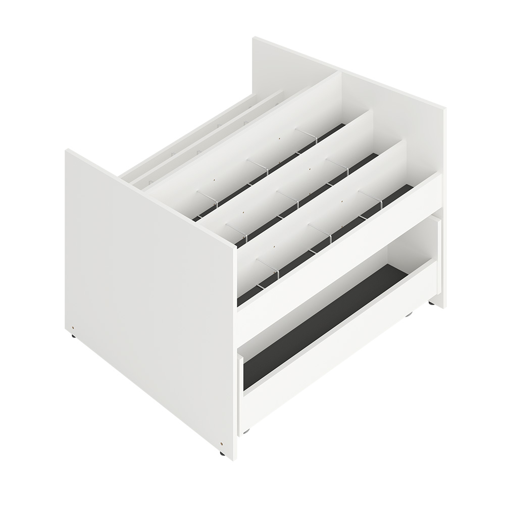 Les compartiments supérieurs sont pourvus de perforations pour deux ou trois séparations. Livré avec séparations, pieds réglables et jeu de roulettes pour le tiroir.