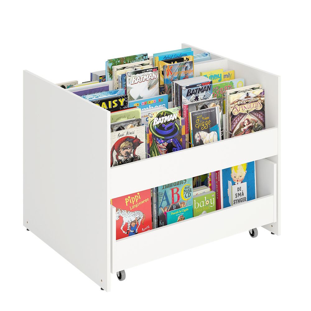 En haut, trois compartiments par section munis de séparations pour exposer les albums de face. En bas, un tiroir pratique par section monté sur roulettes, avec deux compartiments de rangement.
