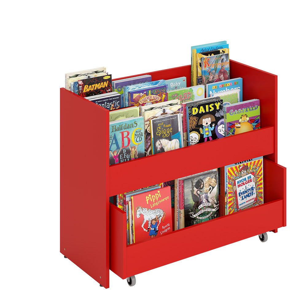 En haut, trois compartiments munis de séparations pour exposer les albums de face. En bas, un tiroir pratique monté sur roulettes, avec deux compartiments de rangement.