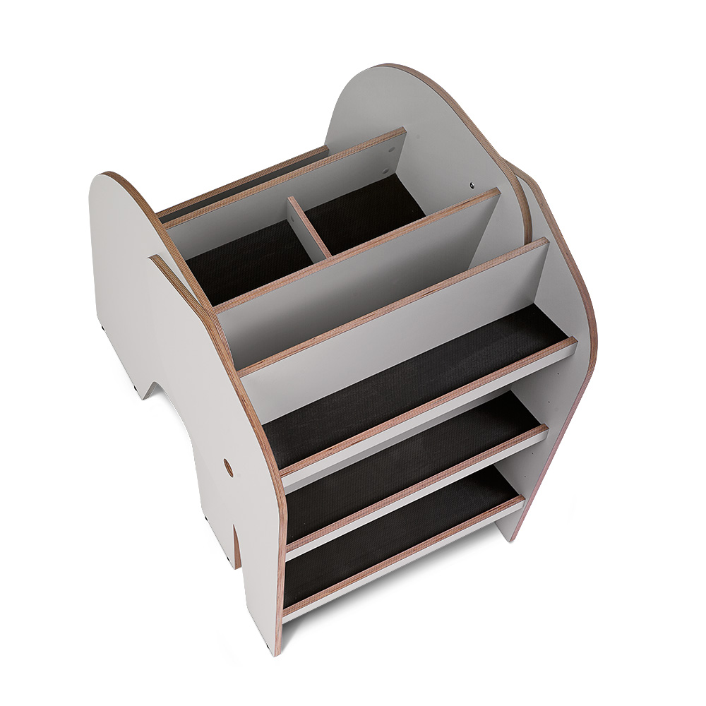 Nous utilisons du contreplaqué de bouleau – ici avec les bords visibles – pour créer une surface à la fois durable et robuste. Idéal pour les environnements de bibliothèque les plus exigeants !