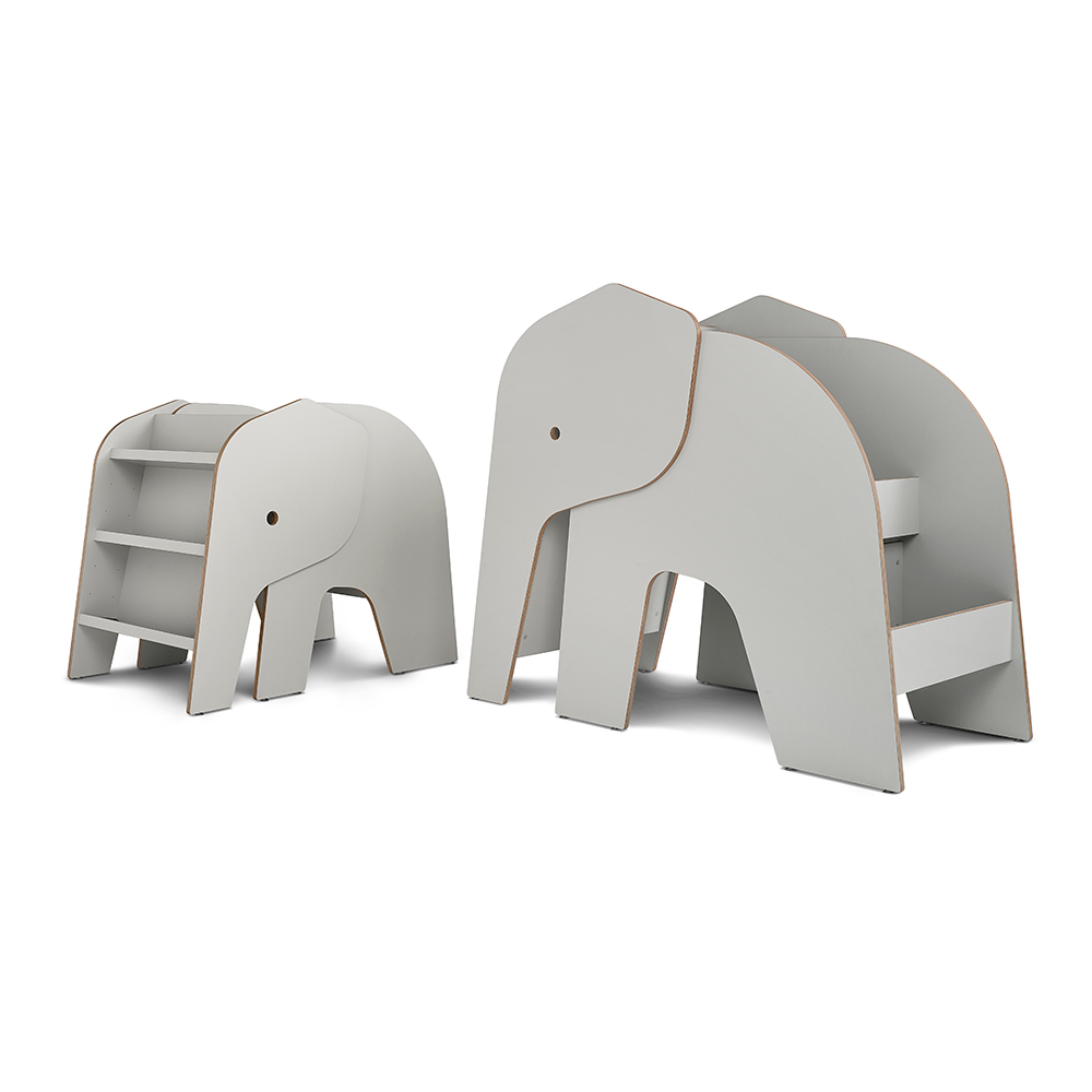 Petit Elof aide avec la charge! Elof est une version plus petite de Elna. Il aime aussi être avec les enfants et il est heureux d'être nourris avec des livres (c'est permis!). Tablettes pour exposer des livres de face (le tronc) Selon la taille des livres choisis la défense d'Elof peut être équipé de trois étagères ( peuvent être ajustées)
