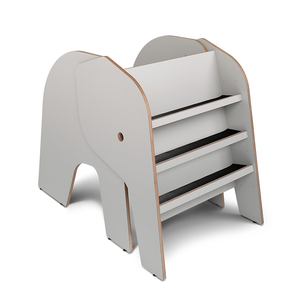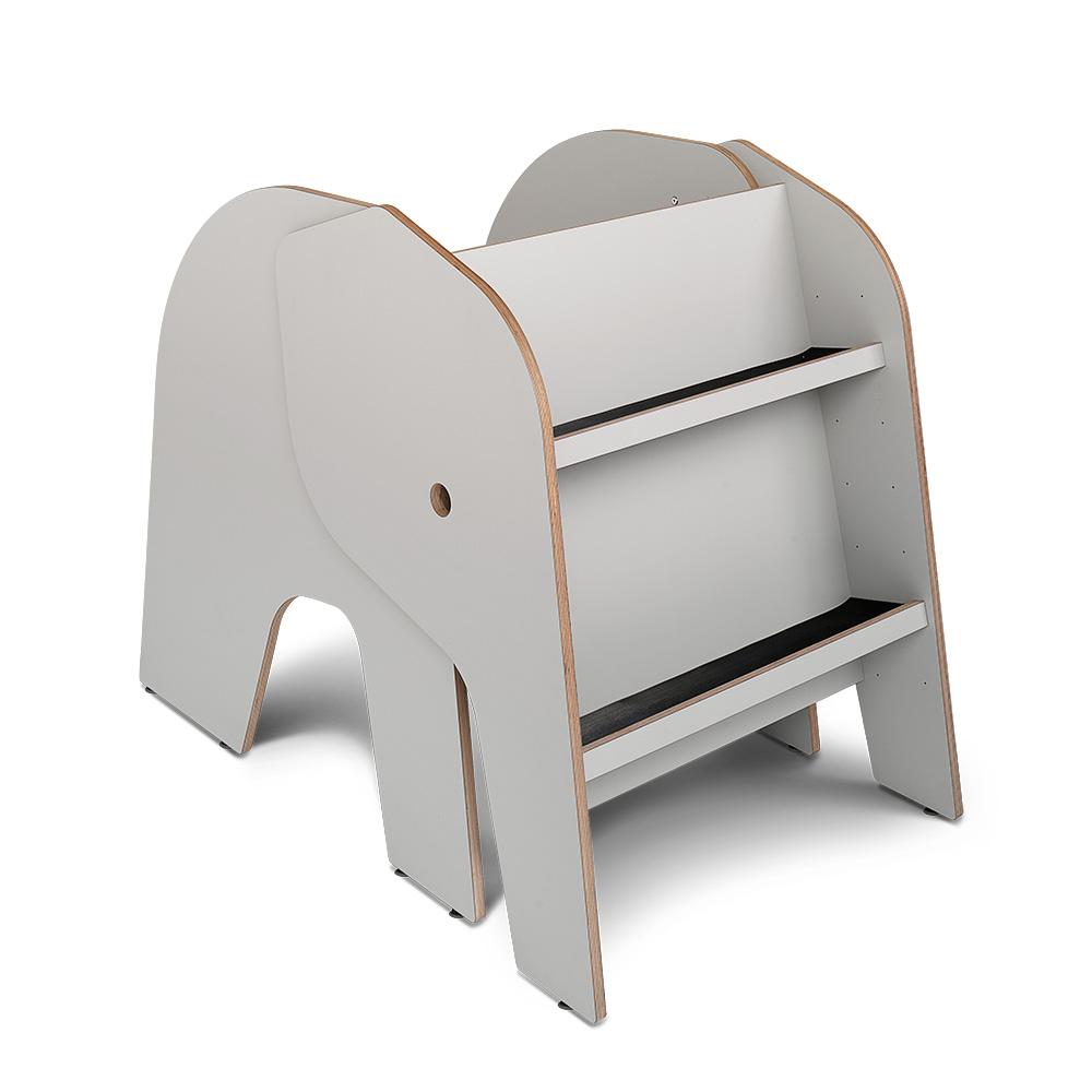 Petit Elof aide avec la charge! Elof est une version plus petite de Elna. Il aime aussi être avec les enfants et il est heureux d'être nourris avec des livres (c'est permis!). Tablettes pour exposer des livres de face (le tronc) Selon la taille des livres choisis la défense d'Elof peut être équipé de trois étagères ( peuvent être ajustées)