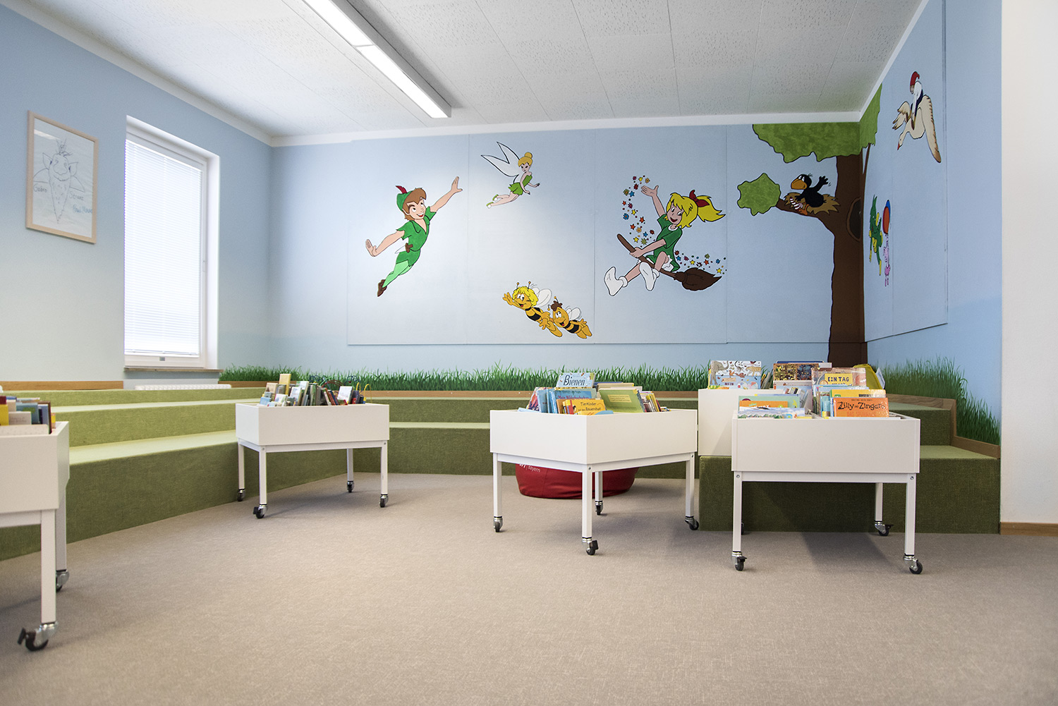 Le bac à albums possède un tapis intérieur en caoutchouc strié qui permet de maintenir les livres en position verticale et de les empêcher de tomber. Roulettes disponibles sur demande.