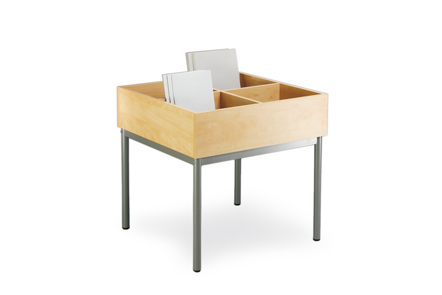 Disponible en quatre hauteurs différentes, ce bac à albums peut être utilisé de manière créative pour créer une séparation entre plusieurs zones. Placés les uns à côté des autres, les bacs créent un bel espace de consultation pouvant accueillir un grand nombre de livres et offrant une vue d’ensemble des médias proposés.