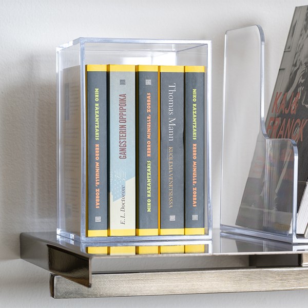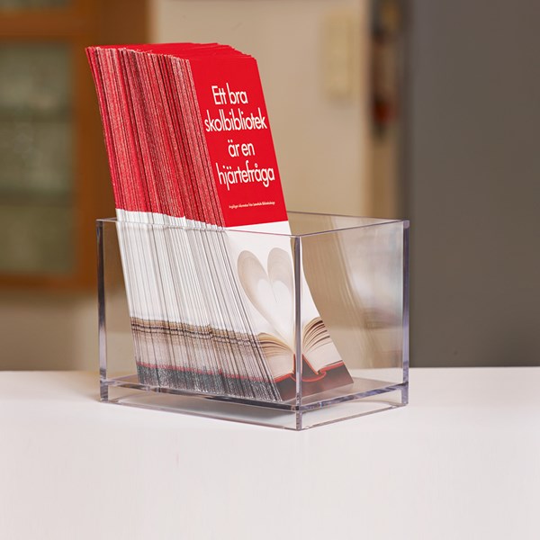 Deux modes d’utilisation : avec ouverture vers le haut pour remplir la boîte de différents objets thématiques ou cadeaux, ou avec ouverture vers le bas pour exposer des brochures, livres, journaux et magazines.