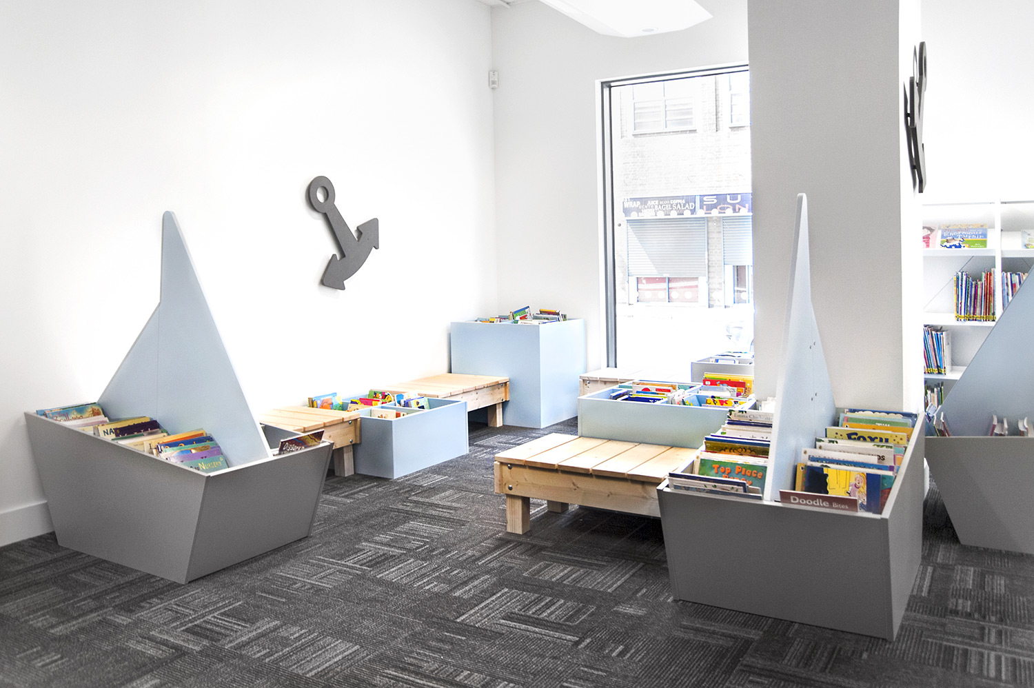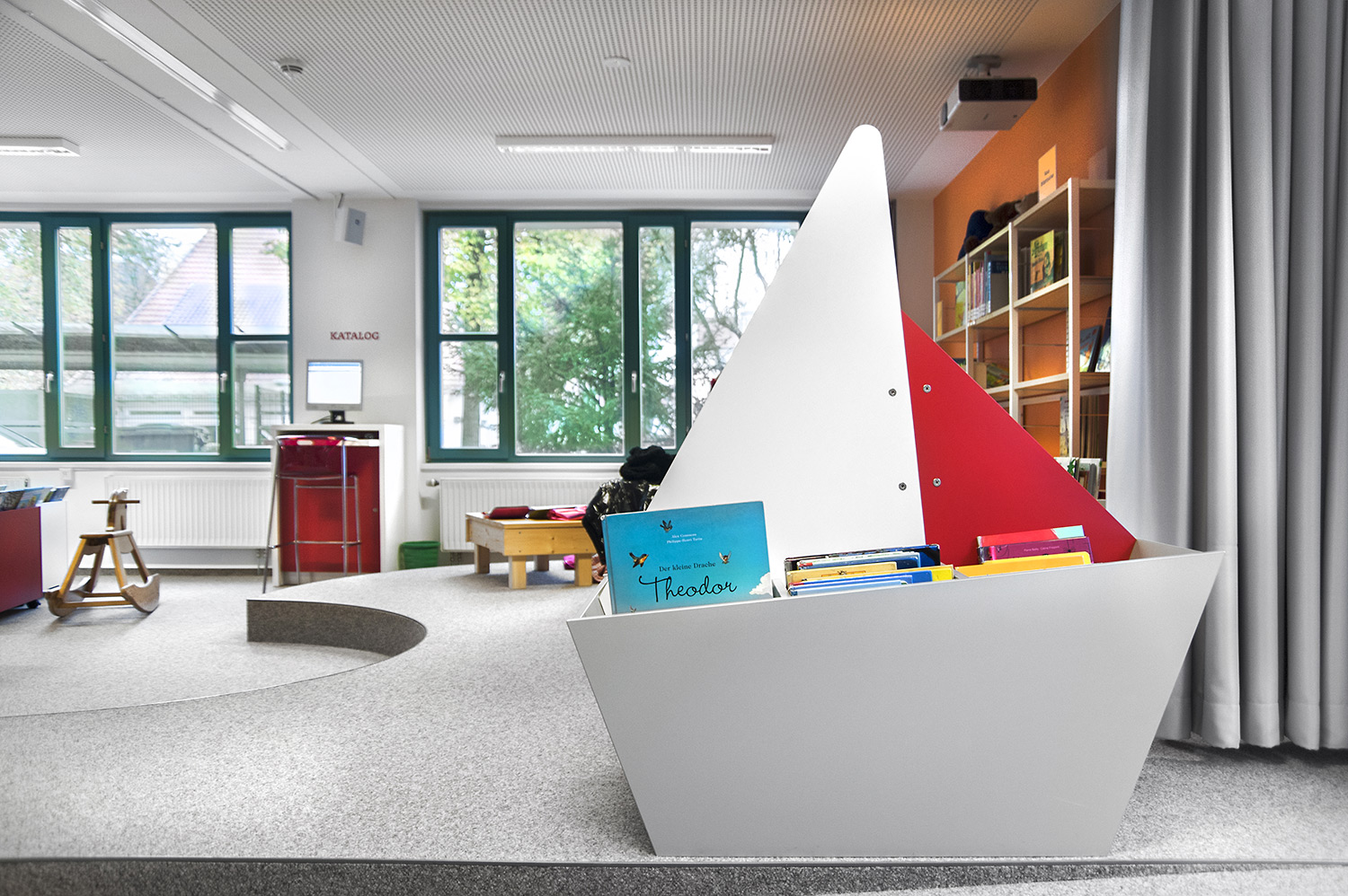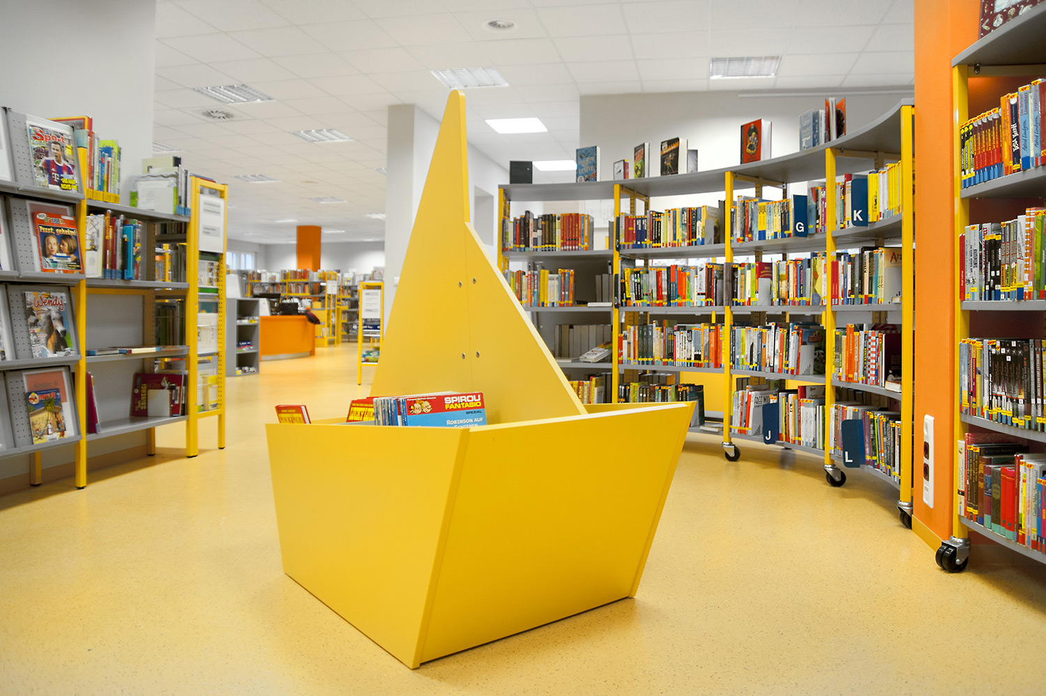 Les étonnants bacs à livres avec 6 casiers en forme de voiliers font beaucoup d’effet. La coque plus haute sur l’avant, souligne l’effet de dynamique du bateau et vous offre la possibilité de classer les livres par tranches d’âges : à l’arrière les livres pour les petits, au niveau de la proue, ceux pour les plus grands.