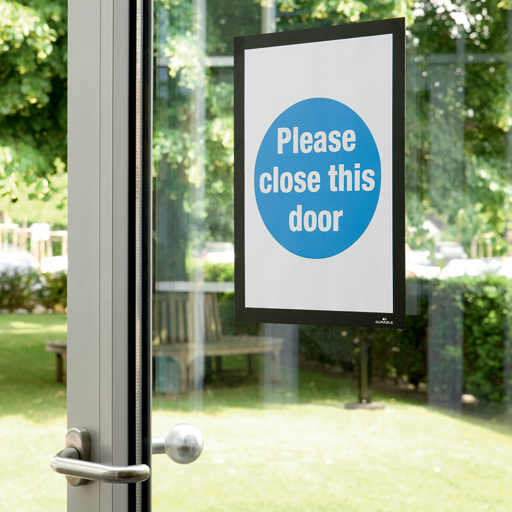 Les cadres (Duraframe® Poster Sun) adhèrent solidement au support sans colle (ce qui permet d’éviter la formation de bulles d’air). Idéal pour afficher des publicités ou des informations sur de grandes fenêtres ou d’autres supports en verre.