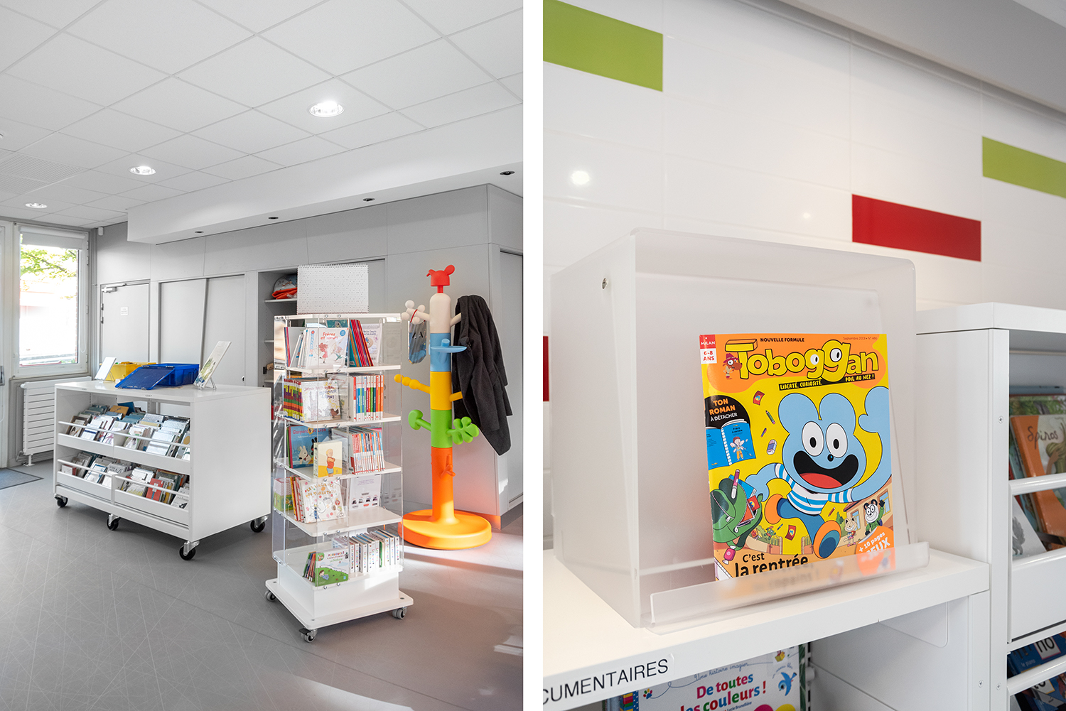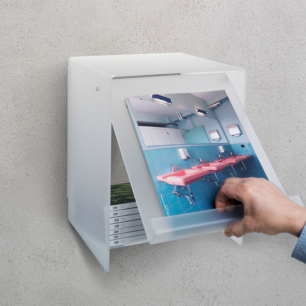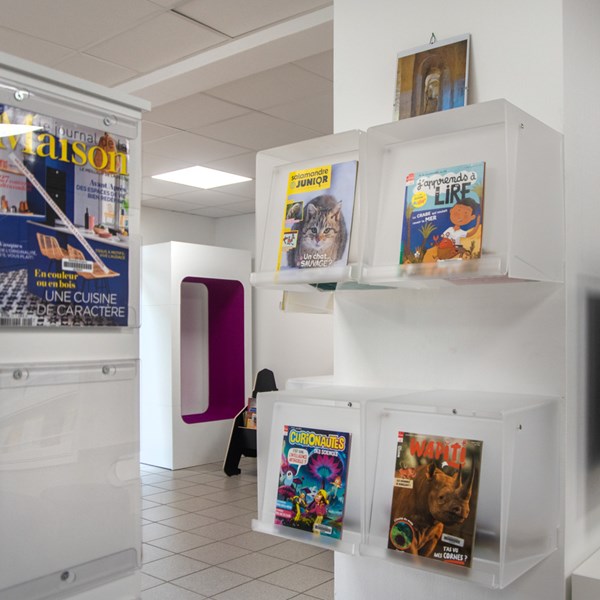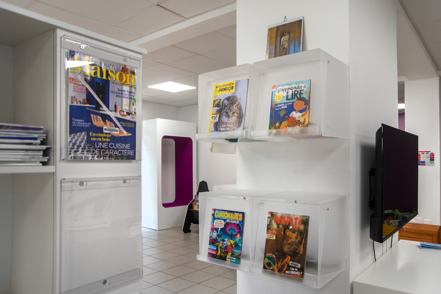 Casiers en acrylique destinés à la présentation et au rangement des périodiques.