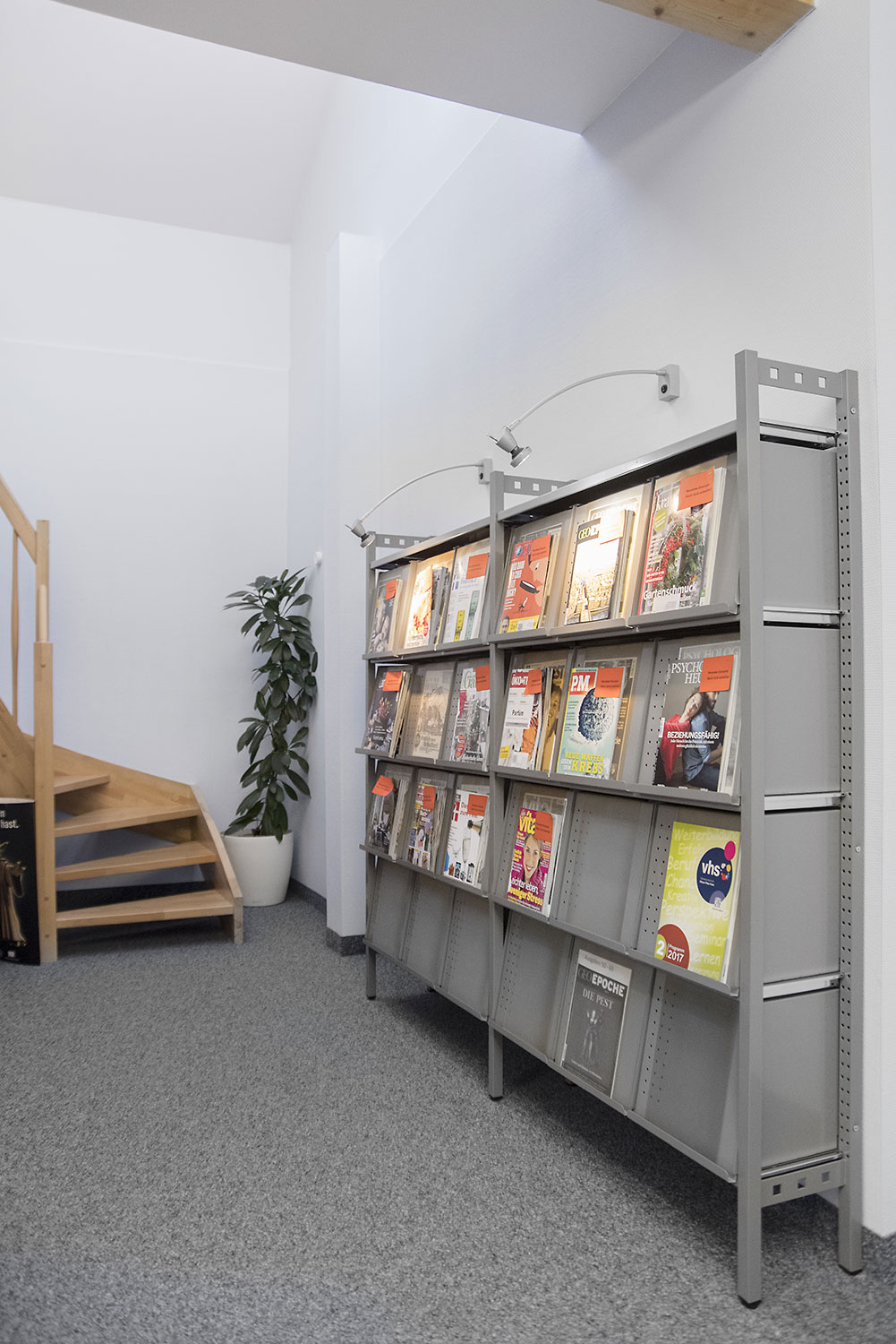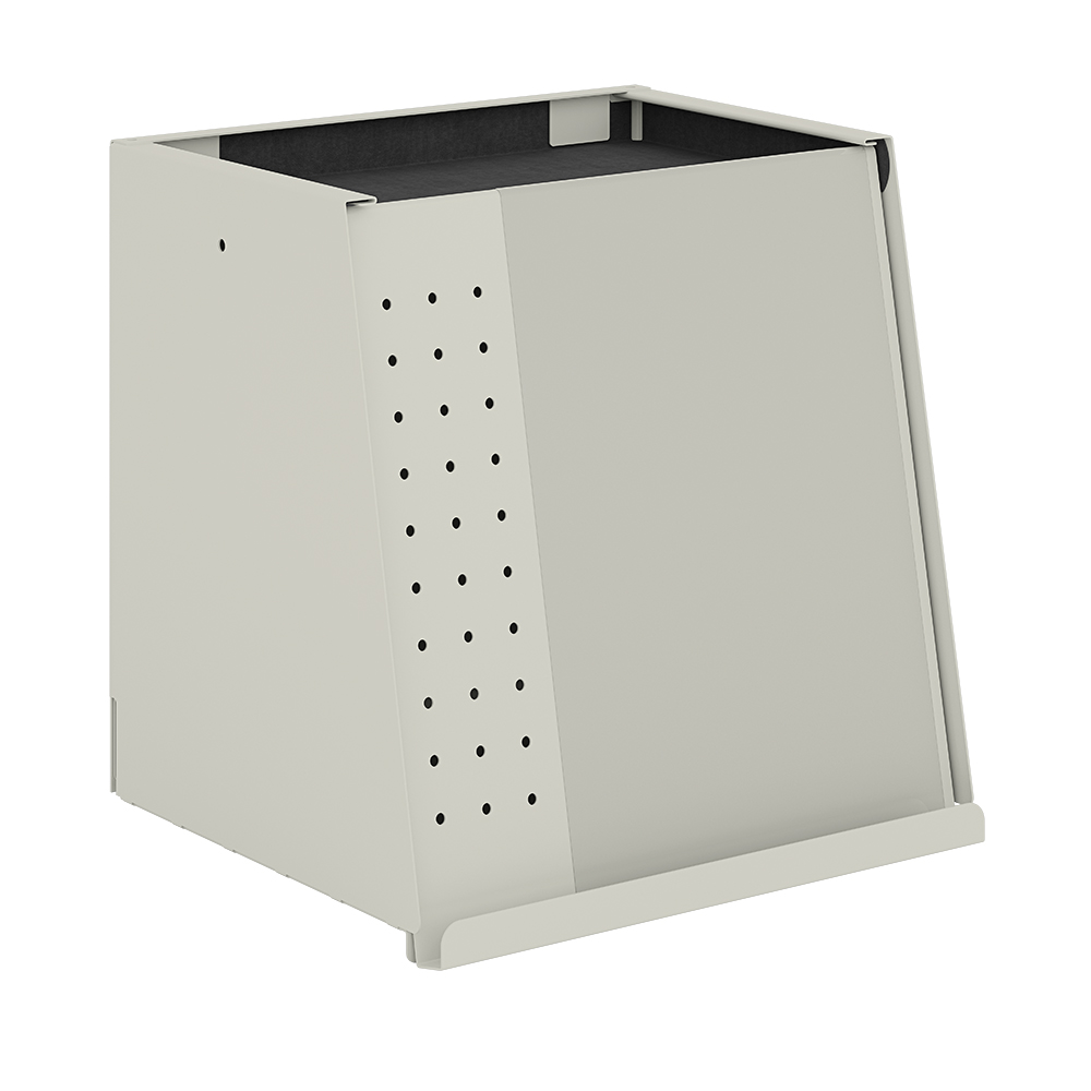 Boîte pratique pour étagère d’une profondeur maximale de 250 mm. Montre les périodiques avec la couverture tournée vers le visiteur.
