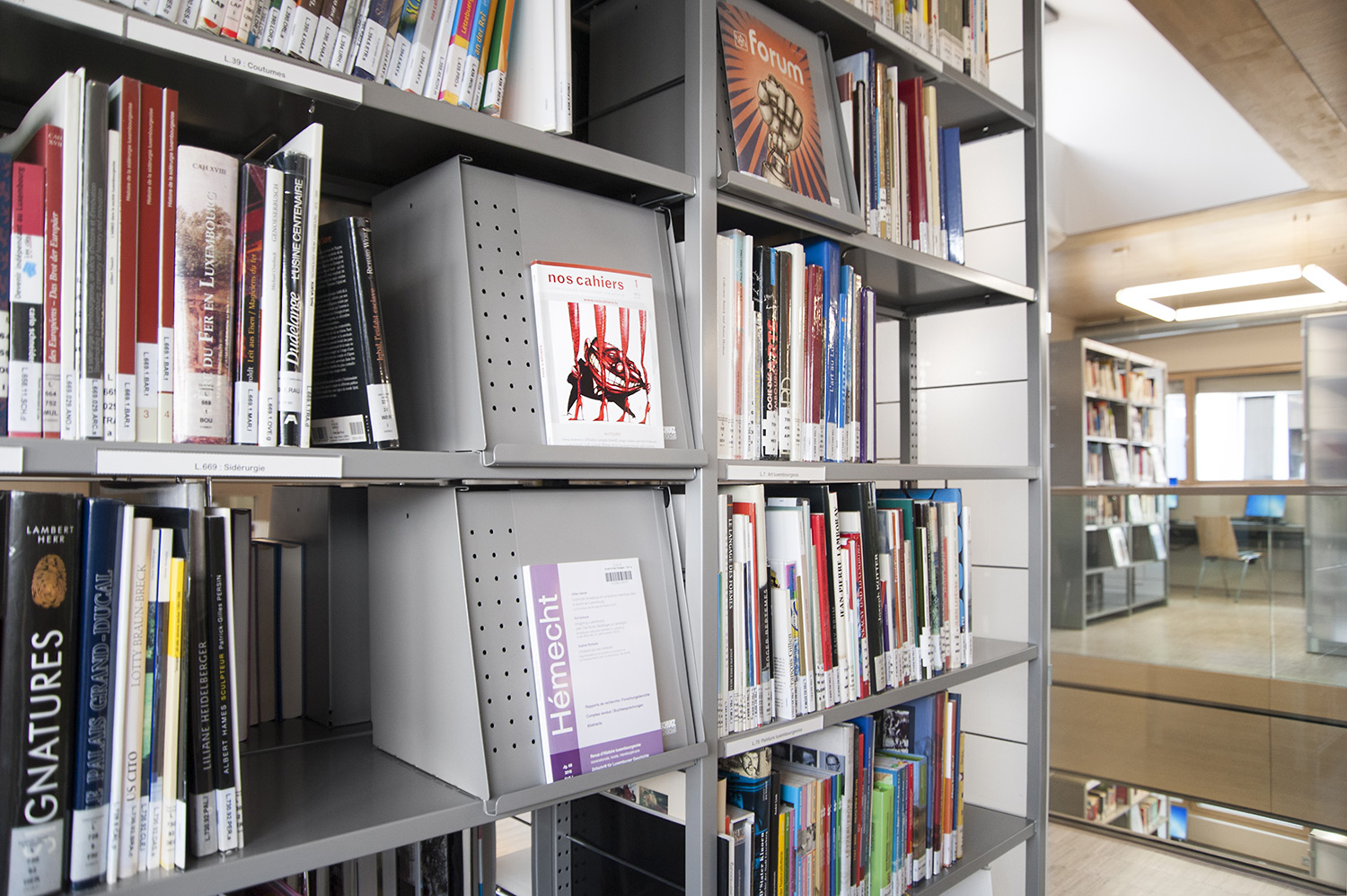Les imprimés d’actualité sont conservés dans des casiers, derrière des rabats (lever et repousser). Le périodique exposé est maintenu en place par un film transparent qui couvre le rabat.