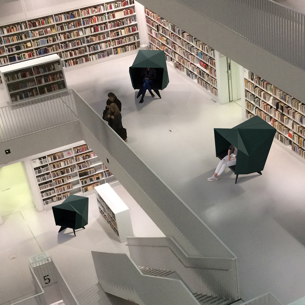 HabiCave est un design danois sculpté en s'inspirant de l'origami japonais. La simplicité et l'esthétique réfléchie font appel aux sens et le matériau acoustique contribue non seulement à réduire le niveau de bruit à l'intérieur de la grotte mais aussi dans la pièce.