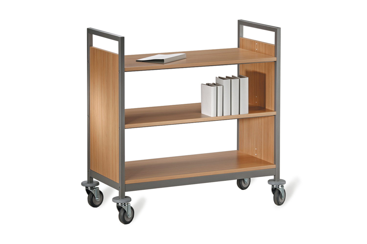 Le chariot à livres Classic Line est disponible en sept modèles et possède des roulettes avec butoirs afin de protéger les murs et les portes.