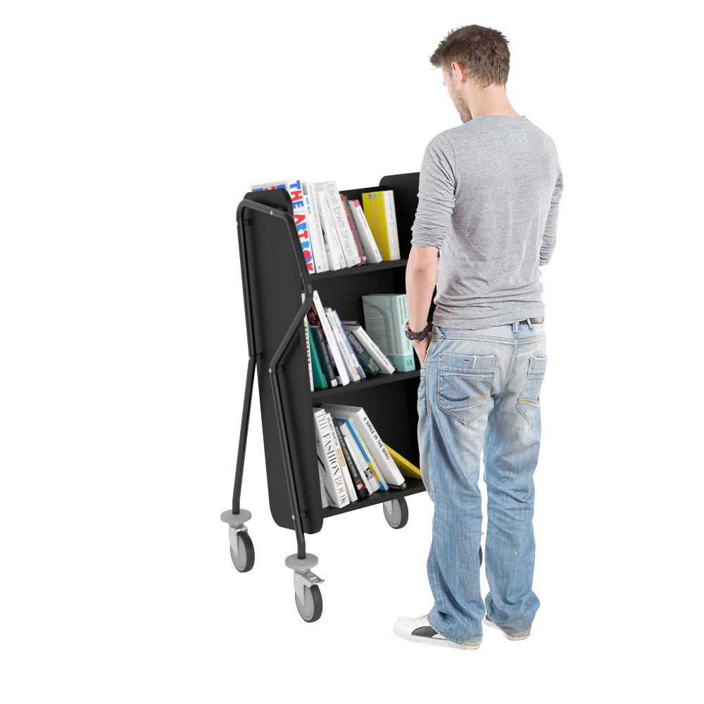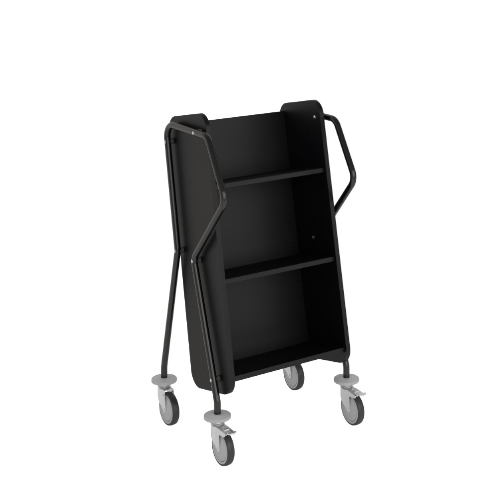 Chariot à 3 étagères fixes généreusement espacées et facilement inclinables. Convient aussi pour les classeurs.