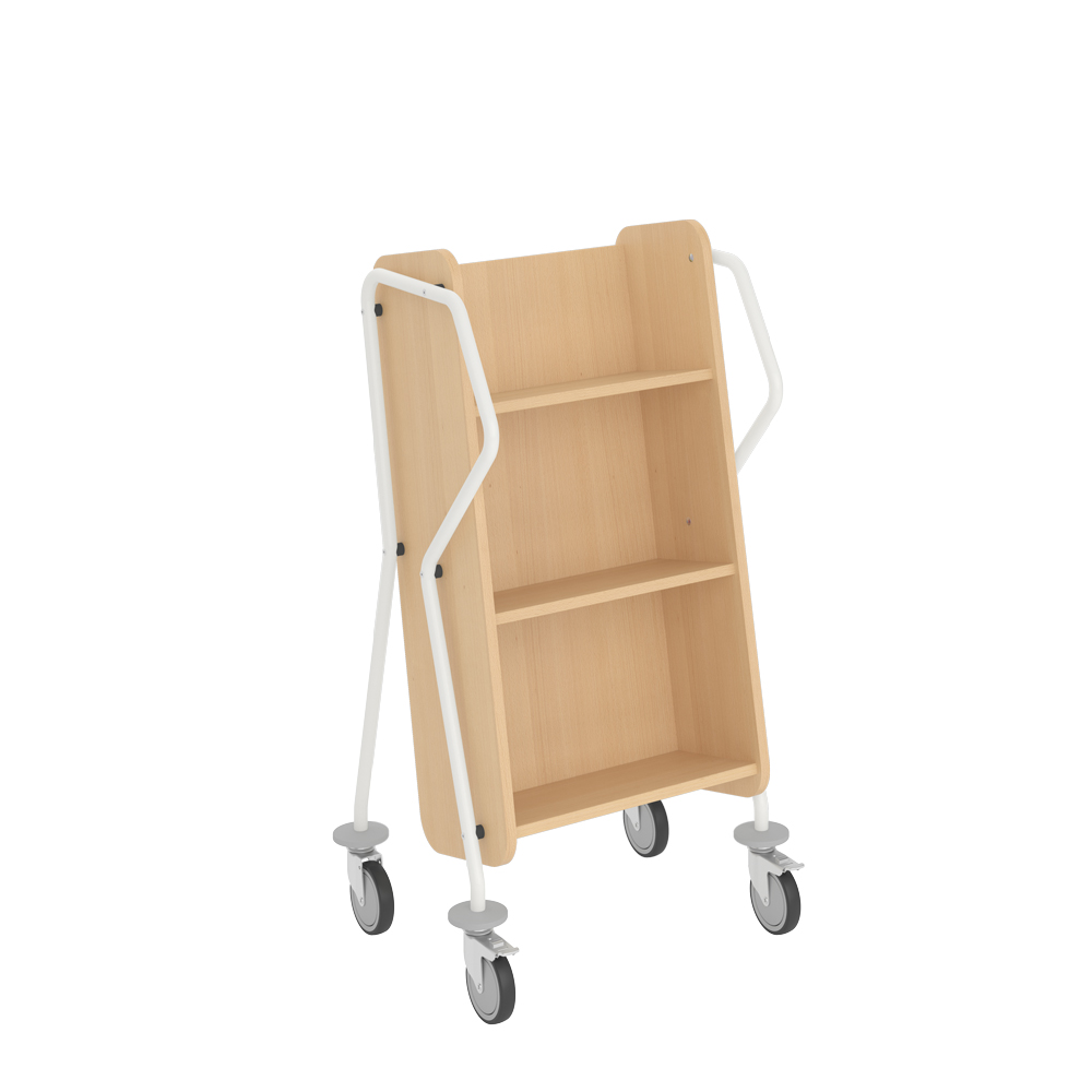 Chariot à 3 étagères fixes généreusement espacées et facilement inclinables. Convient aussi pour les classeurs.