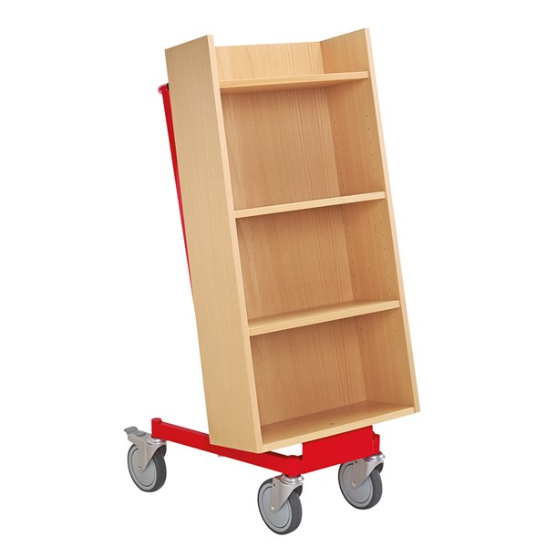 Chariot à livres ergonomique, simple face, équipé de 4 étagères. Les deux étagères centrales sont réglables pour s’adapter à différents formats de supports.