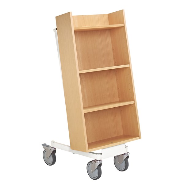 Chariot à livres ergonomique, simple face, équipé de 4 étagères. Les deux étagères centrales sont réglables pour s’adapter à différents formats de supports.