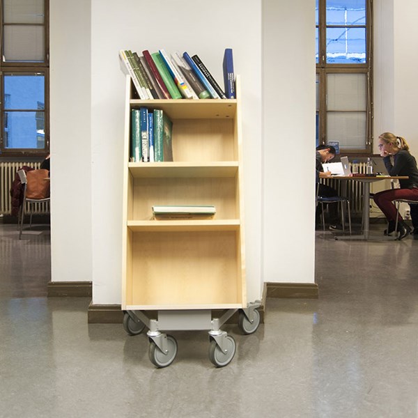 Chariot à livres ergonomique, simple face, équipé de 4 étagères. Les deux étagères centrales sont réglables pour s’adapter à différents formats de supports.