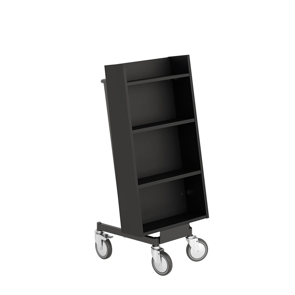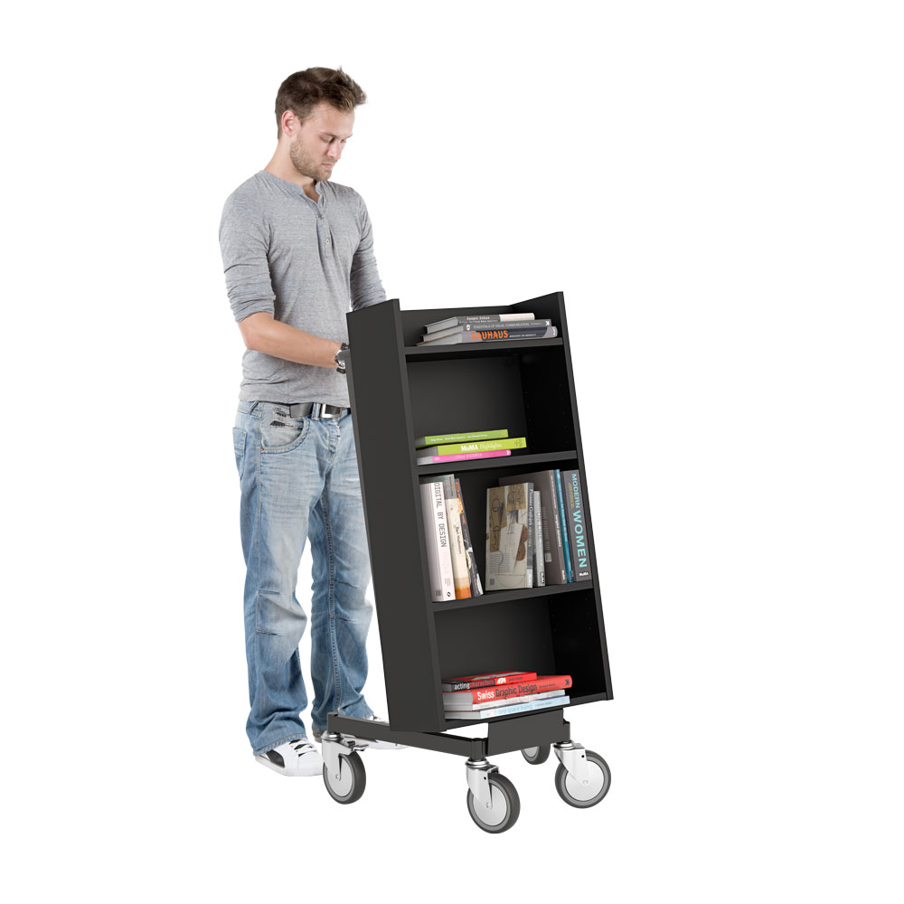 Chariot à livres ergonomique, simple face, équipé de 4 étagères. Les deux étagères centrales sont réglables pour s’adapter à différents formats de supports.