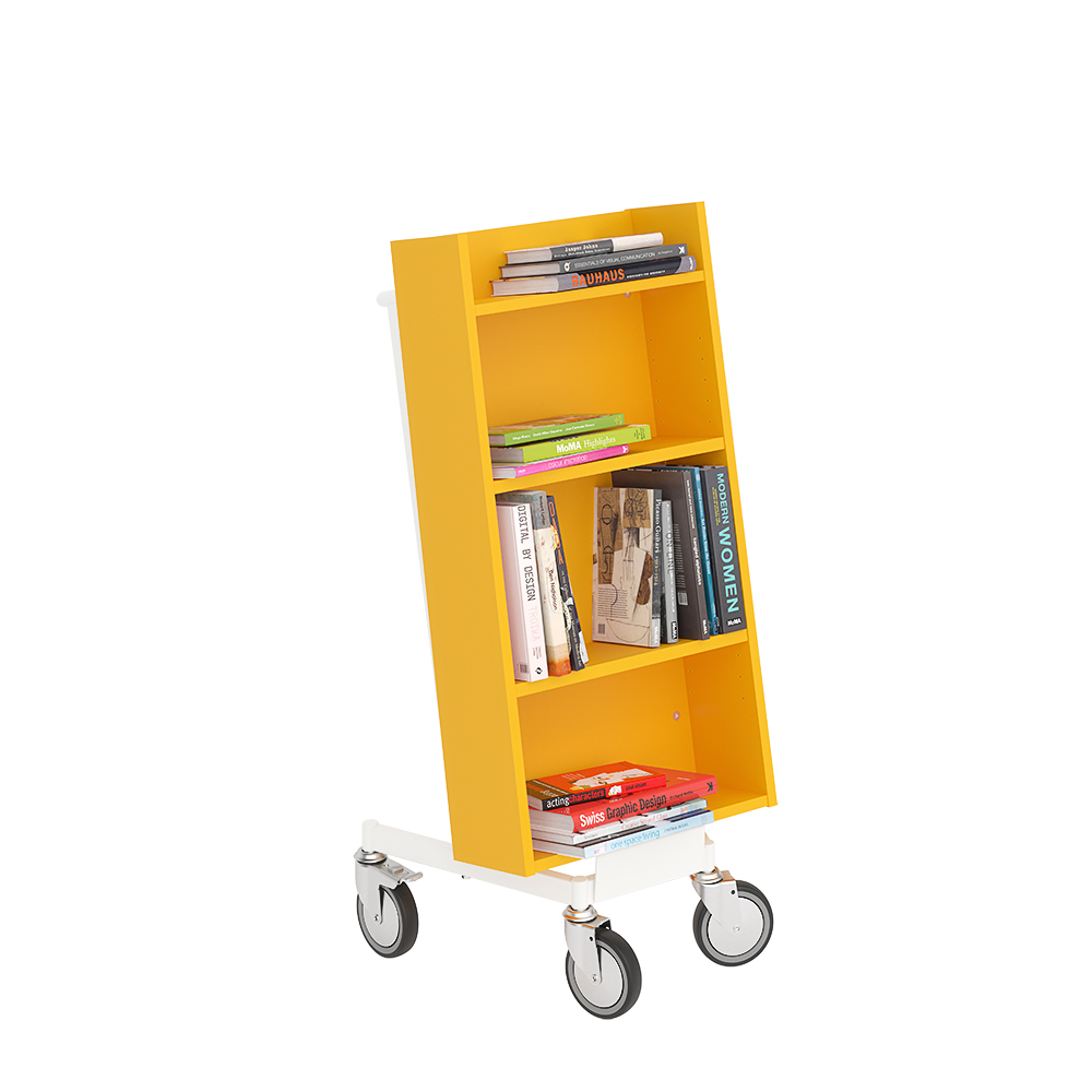 Chariot à livres ergonomique, simple face, équipé de 4 étagères. Les deux étagères centrales sont réglables pour s’adapter à différents formats de supports.