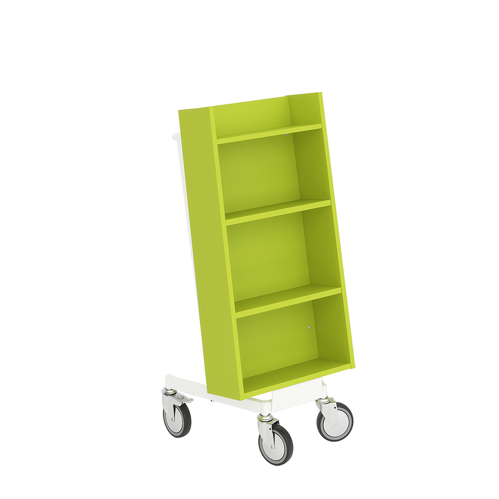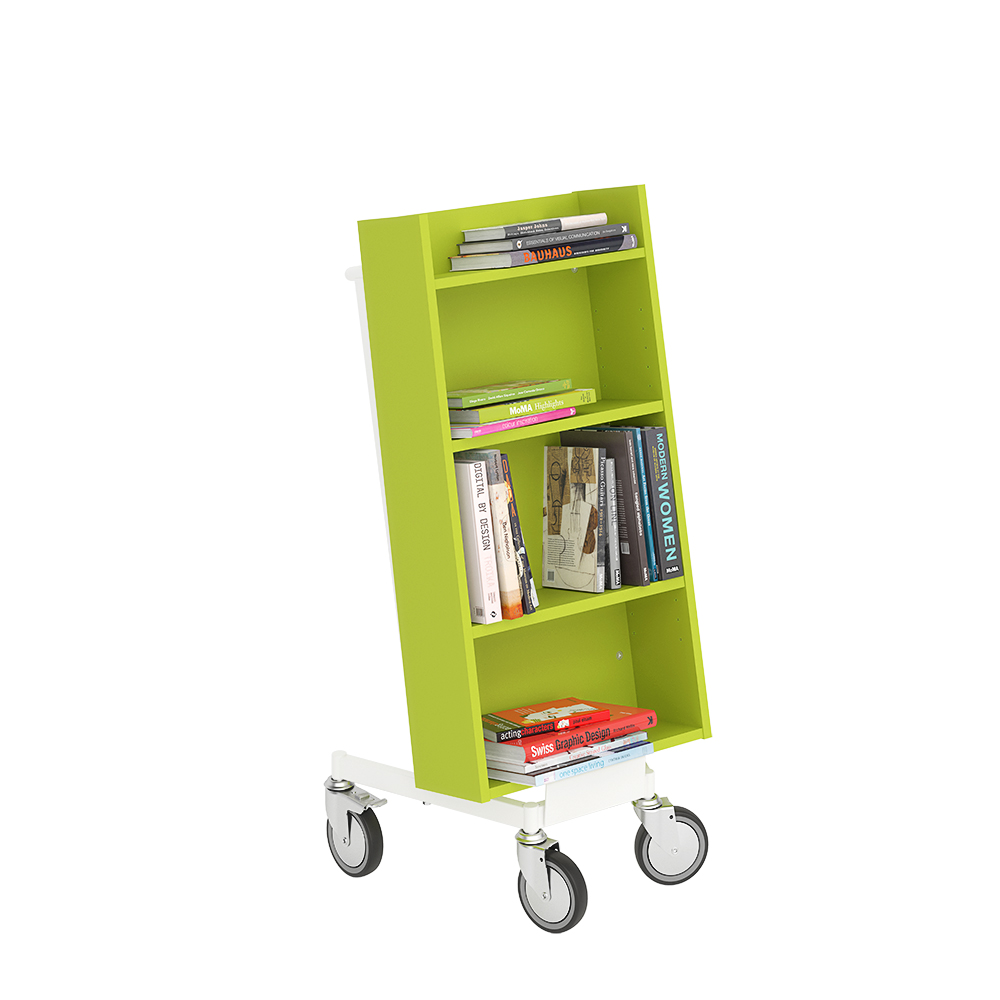 Chariot à livres ergonomique, simple face, équipé de 4 étagères. Les deux étagères centrales sont réglables pour s’adapter à différents formats de supports.