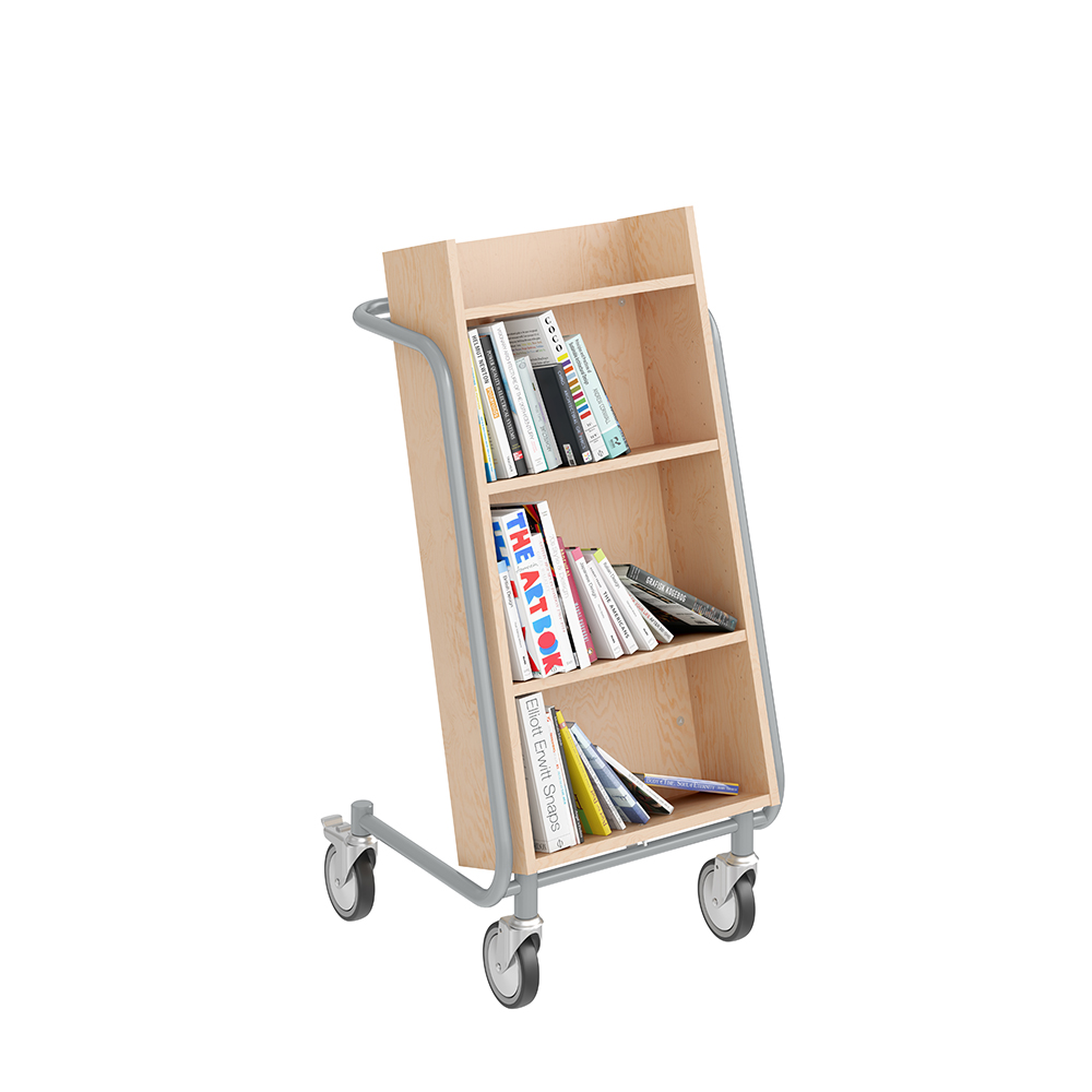 Chariot à livres ergonomique, simple face, équipé de 4 étagères. Les deux étagères centrales sont réglables pour s’adapter à différents formats de supports.