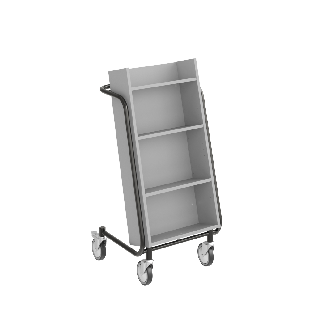 Chariot à livres ergonomique, simple face, équipé de 4 étagères. Les deux étagères centrales sont réglables pour s’adapter à différents formats de supports.
