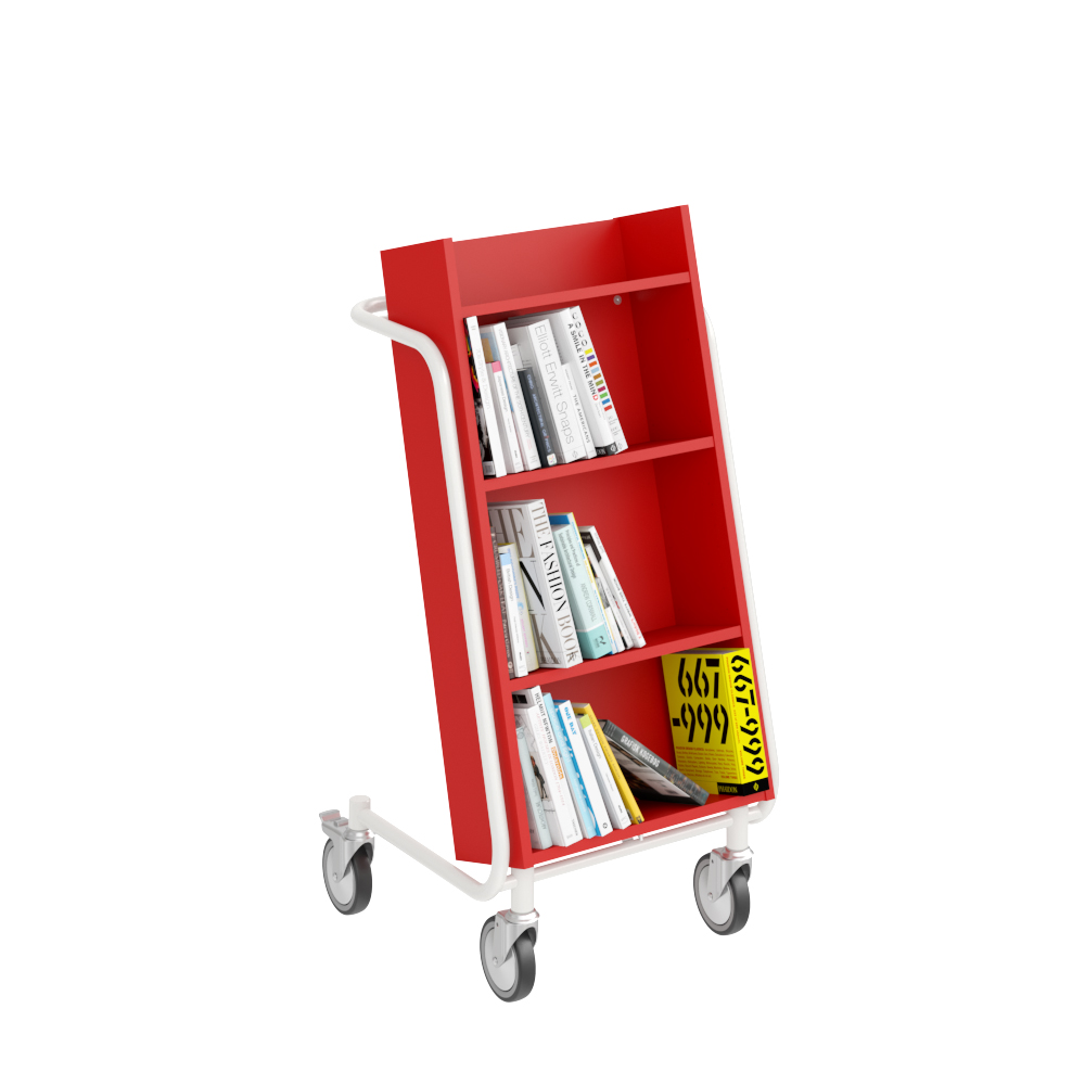 Chariot à livres ergonomique, simple face, équipé de 4 étagères. Les deux étagères centrales sont réglables pour s’adapter à différents formats de supports.