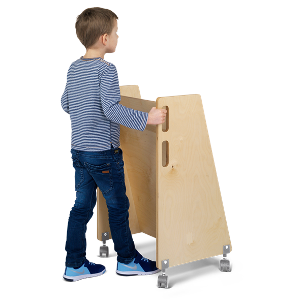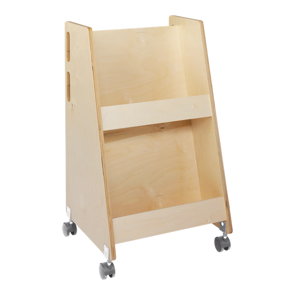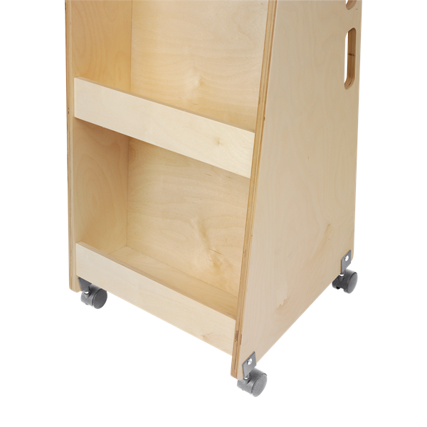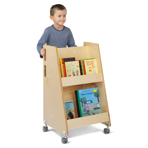 Chariot à livres compact en contreplaqué de bouleau pourvu de 2 tablettes fixes à rebords pour une présentation frontale d’albums/de BD.