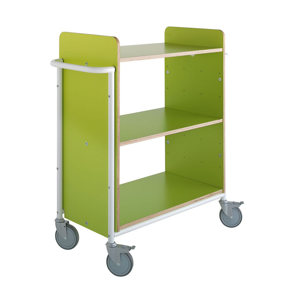 Chariot double face avec trois étagères planes bien dimensionnées.