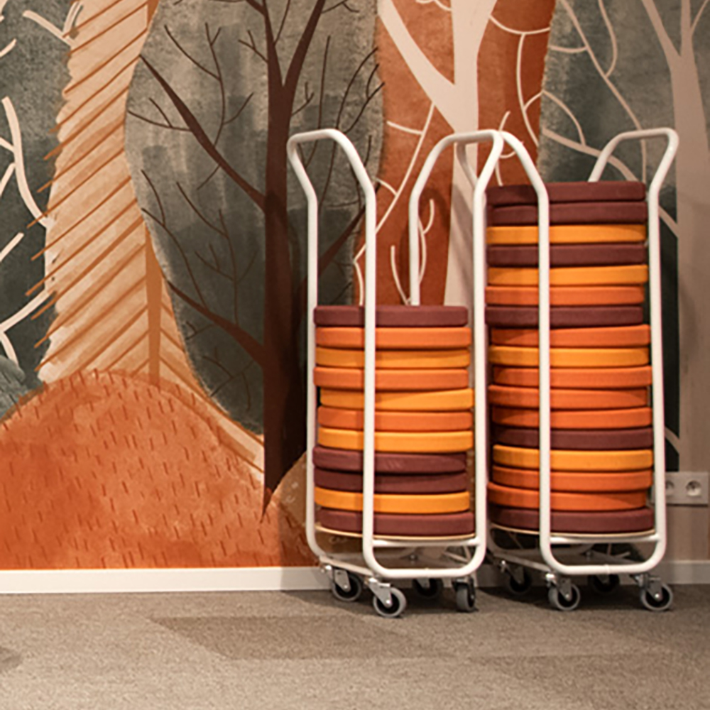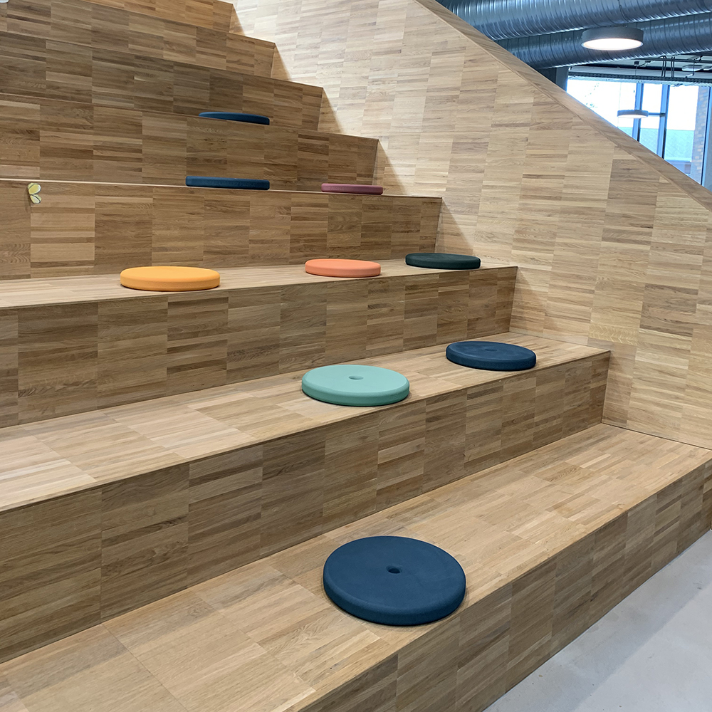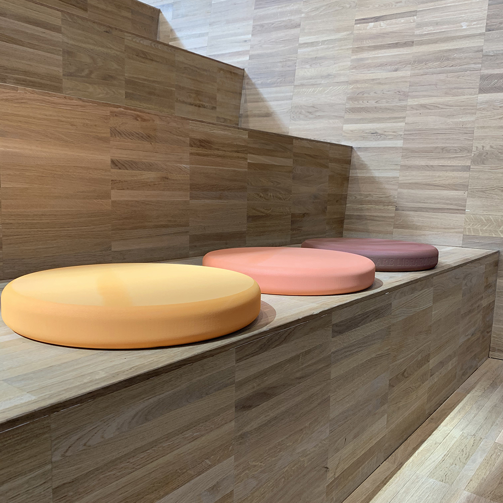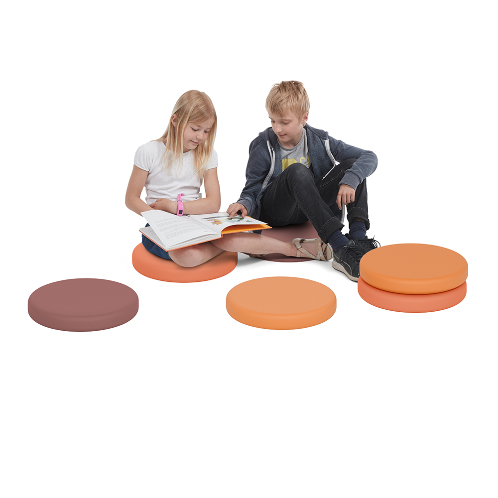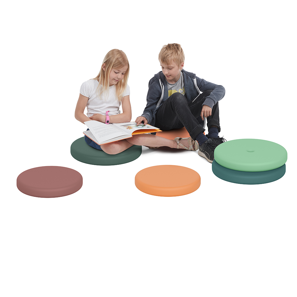 Le coussin existe dans 2 diamètres et dans des coloris différents. A poser sur le sol mais aussi sur gradins ou banquettes.