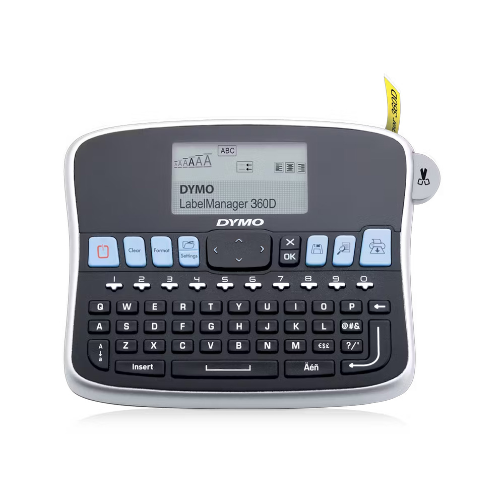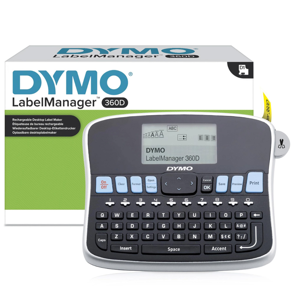La Dymo 360D est compatible avec des rubans de marquage D1 de 6, 9, 12 et 19 mm. Elle est équipée d’un écran plus grand et de fonctionnalités supplémentaires.
