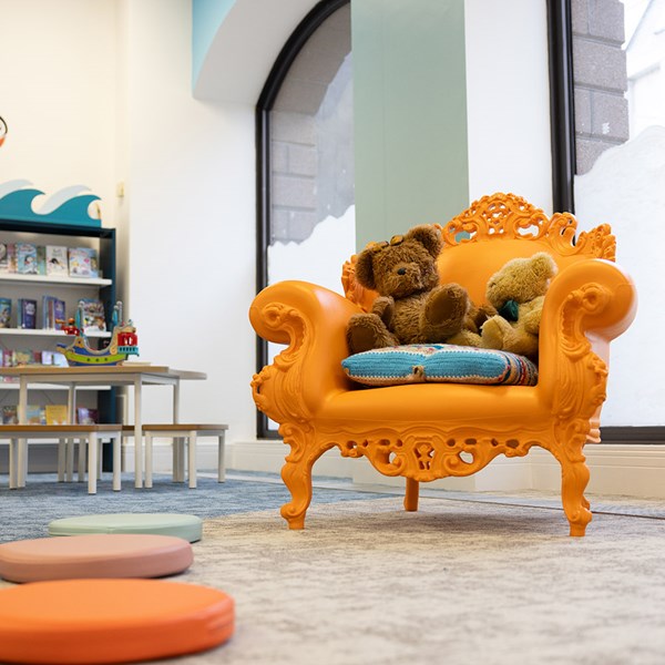 Grand fauteuil pour adultes et un cadre idéal pour raconter des histoires aux enfants.