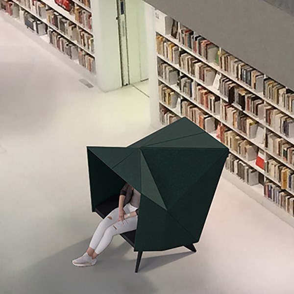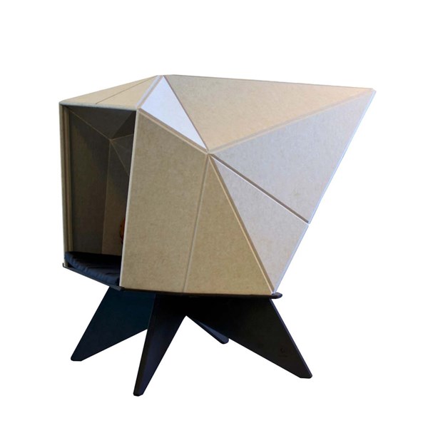 HabiCave est un design danois sculpté en s'inspirant de l'origami japonais. La simplicité et l'esthétique réfléchie font appel aux sens et le matériau acoustique contribue non seulement à réduire le niveau de bruit à l'intérieur de la grotte mais aussi dans la pièce.