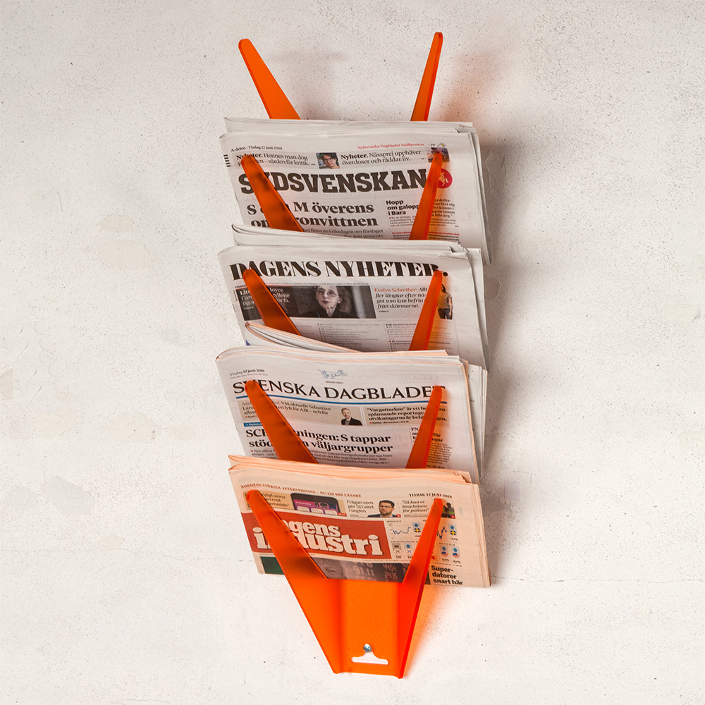 Fixation murale de préférence. Support en acrylique avec encoche en forme de trou de serrure pour les journaux et autres publications