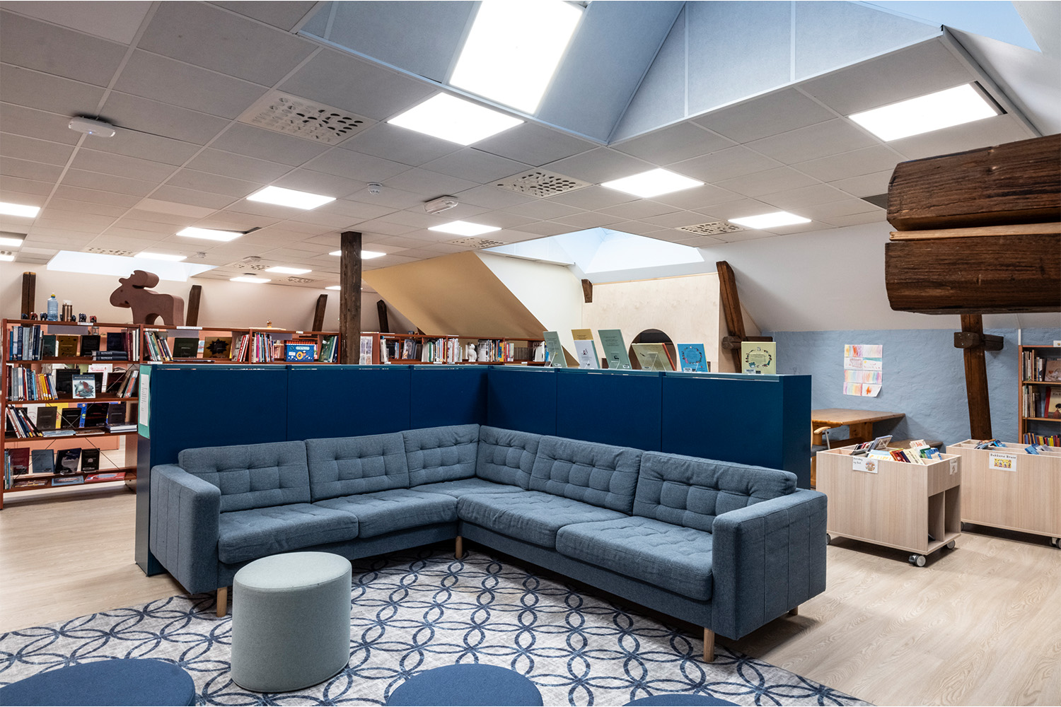 Installée au quatrième étage, sous des plafonds mansardés et des poutres en bois laissées apparentes, la bibliothèque bénéficie d’une palette de couleurs chaudes pour les murs et le mobilier, contribuant à créer une atmosphère accueillante et confortable.