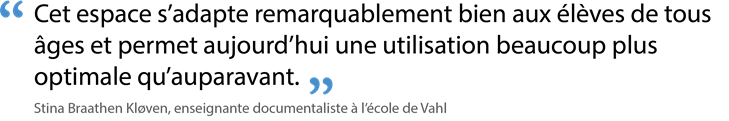 En janvier 2024, l’école de Vahl à Oslo a inauguré sa bibliothèque scolaire entièrement rénovée. Pensé comme un espace à la fois moderne et modulable, ce nouveau lieu s’inscrit dans une conception globale renouvelée. Grâce à de nouveaux systèmes de rayonnage, un design intérieur réfléchi et une organisation claire des différents espaces, la bibliothèque remplit désormais un double rôle : un lieu d’apprentissage et un lieu de rencontre, soutenant les activités pédagogiques ainsi qu’une utilisation en dehors des horaires scolaires.