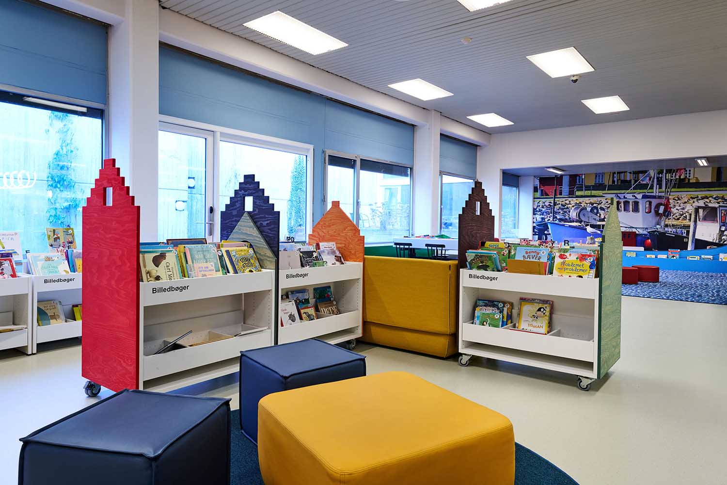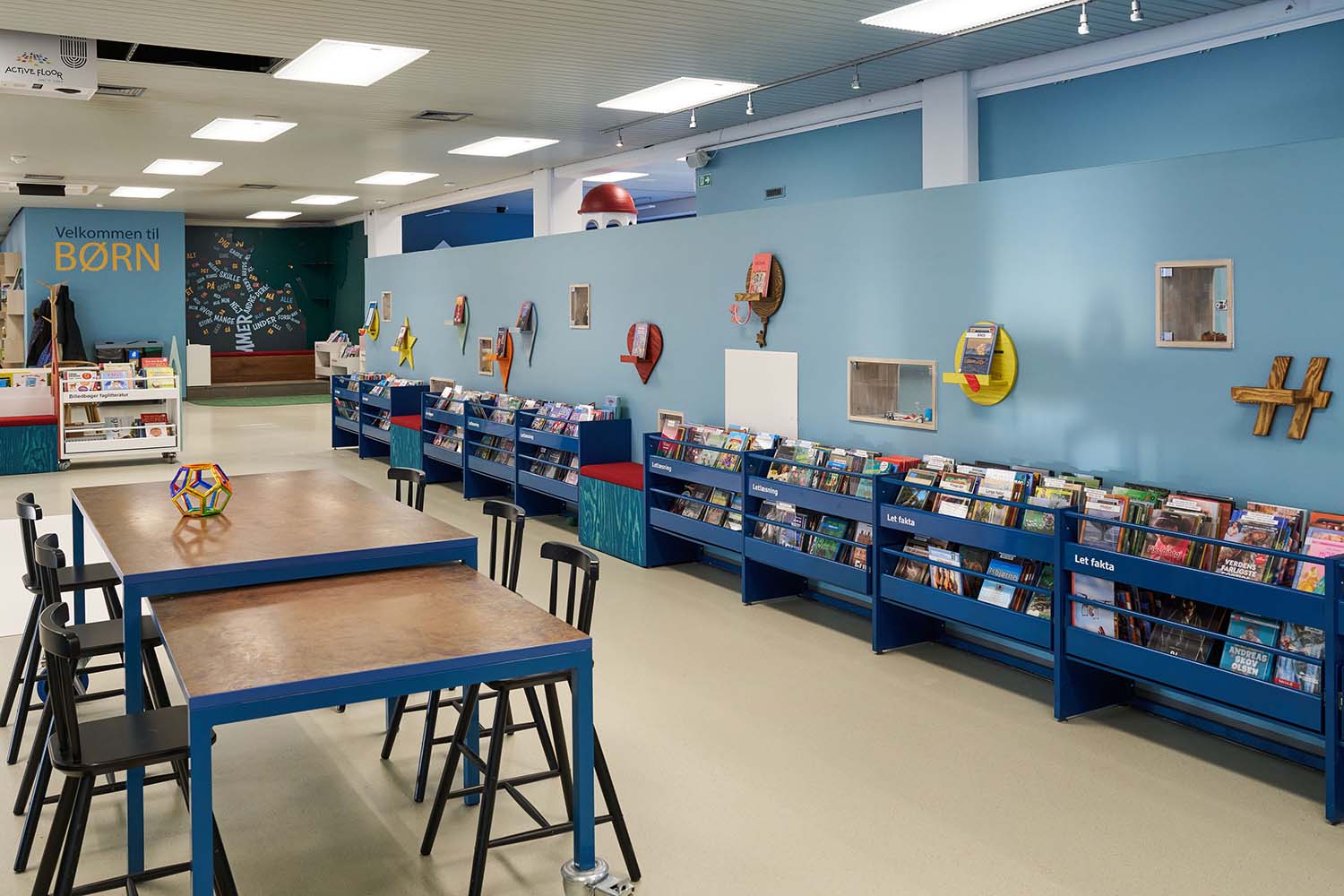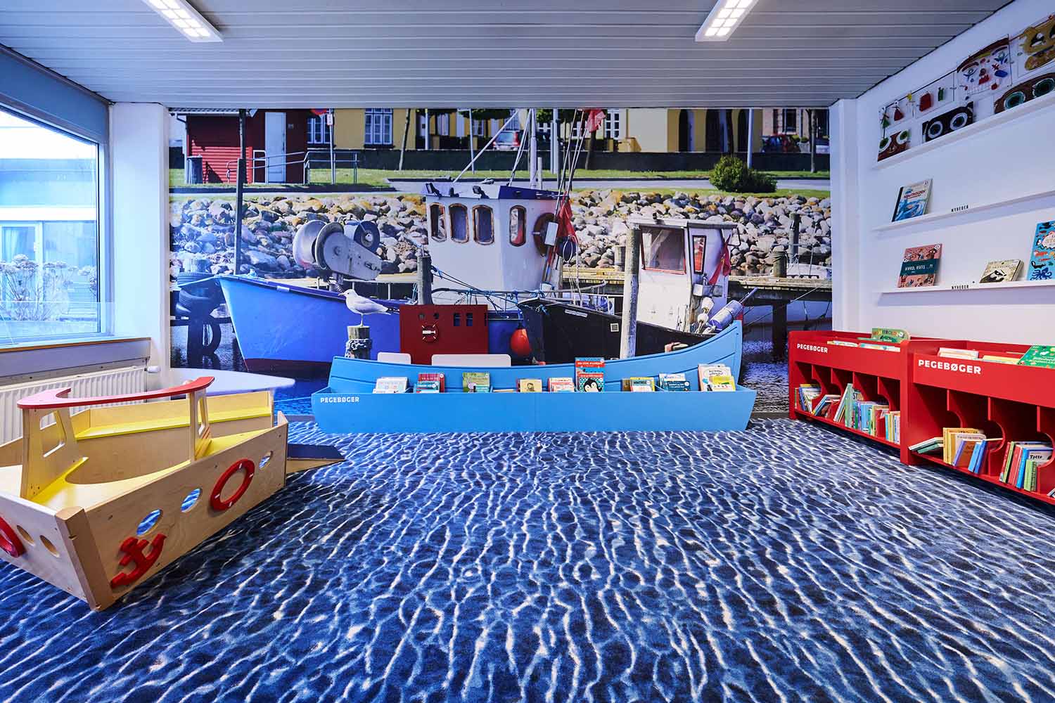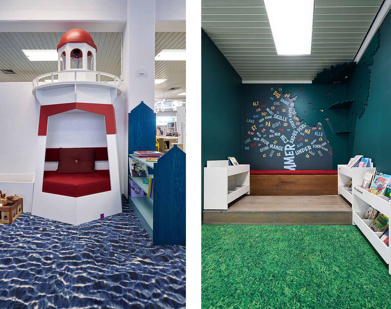 Dès l’entrée de la section jeunesse, l’escalier bleu attire le regard grâce à une intervention graphique forte et colorée, inspirée des formes et des teintes de l’artiste locale Franziska Clausen. Cette référence au contexte culturel local agit comme un signal visuel fort, indiquant clairement aux visiteurs qu’ils entrent dans un univers à part. Dans la « zone maritime », l’installation d’un nouveau phare, dont la lumière tournante évoque le port industriel d’Aabenraa, invite aussi bien aux jeux qu’à la détente, pour les enfants comme pour les adultes.