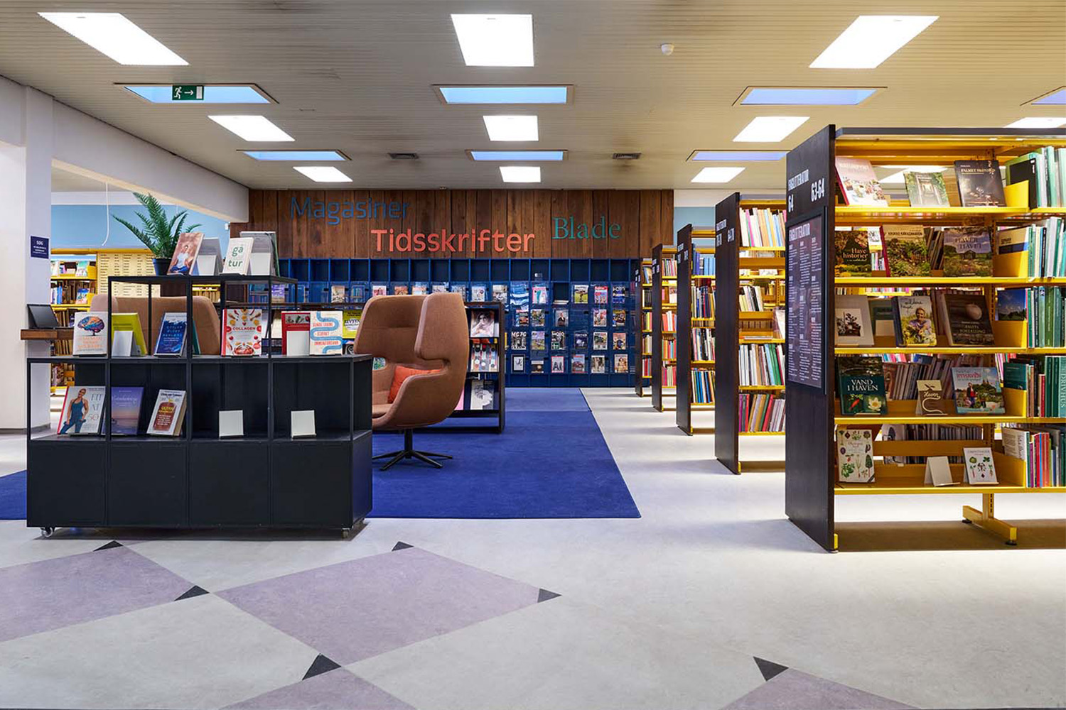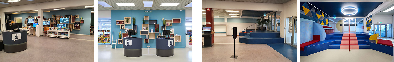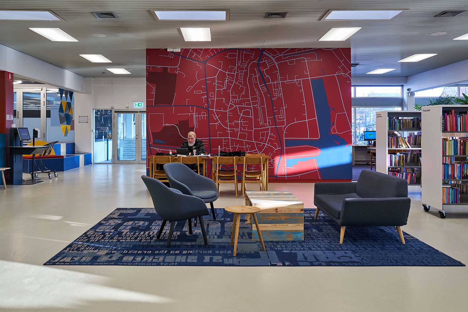 Les rayonnages ont été repensés sous forme de modules plus petits et mobiles, montés sur des roulettes, offrant une grande souplesse d’usage et facilitant les réaménagements lors d’événements ou selon l’évolution des besoins. Dans l’ensemble du bâtiment, des couleurs murales soigneusement choisies, des éléments graphiques et des revêtements de sol ont été intégrés afin de redonner vie à la bibliothèque. Les moquettes, aux couleurs intenses et aux motifs soigneusement étudiés, contribuent à créer une atmosphère stimulante et conviviale, tout en apportant un sentiment de confort presque domestique.