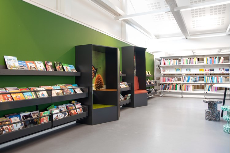 Chaque section de l'espace des enfants est unique et distincte les unes des autres. Les couleurs, le décor et le mobilier sur mesure font se démarquer chaque secteur et délimitent clairement le passage d'une zone à l'autre comme par exemple, de la forêt à la plage. Comme le concept biophilique fait partie intégrante de la section jeunesse, toutes les zones et tous les espaces sont reliés par la nature et donnent l'impression d'être à l'extérieur, où que l'on se trouve dans la bibliothèque.