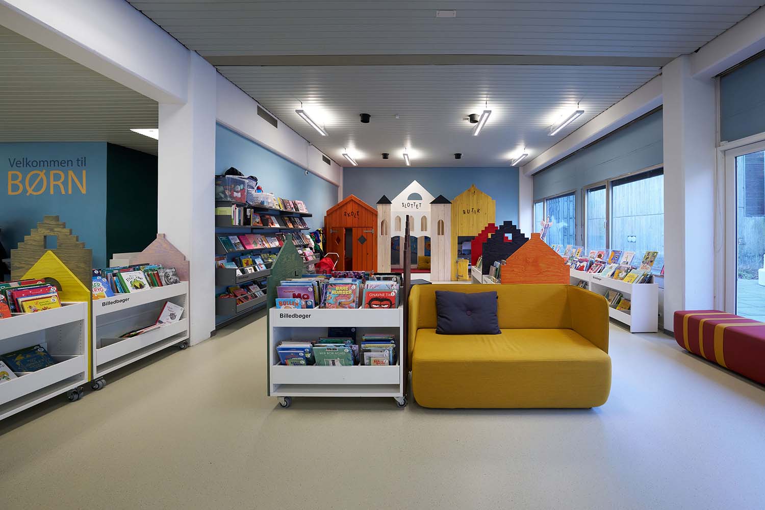 Le nouvel espace enfants de la bibliothèque de Sæby a été réaménagé avec de nombreuses cabanes colorées représentants magasins et échoppes et forme ainsi un lieu particulièrement ludique. De nouveaux habillages ont été ajoutés aux bacs à albums et une signalisation originale s’intègrent parfaitement au lieu de sorte qu’ils sont devenus une partie intégrante de la "ville".