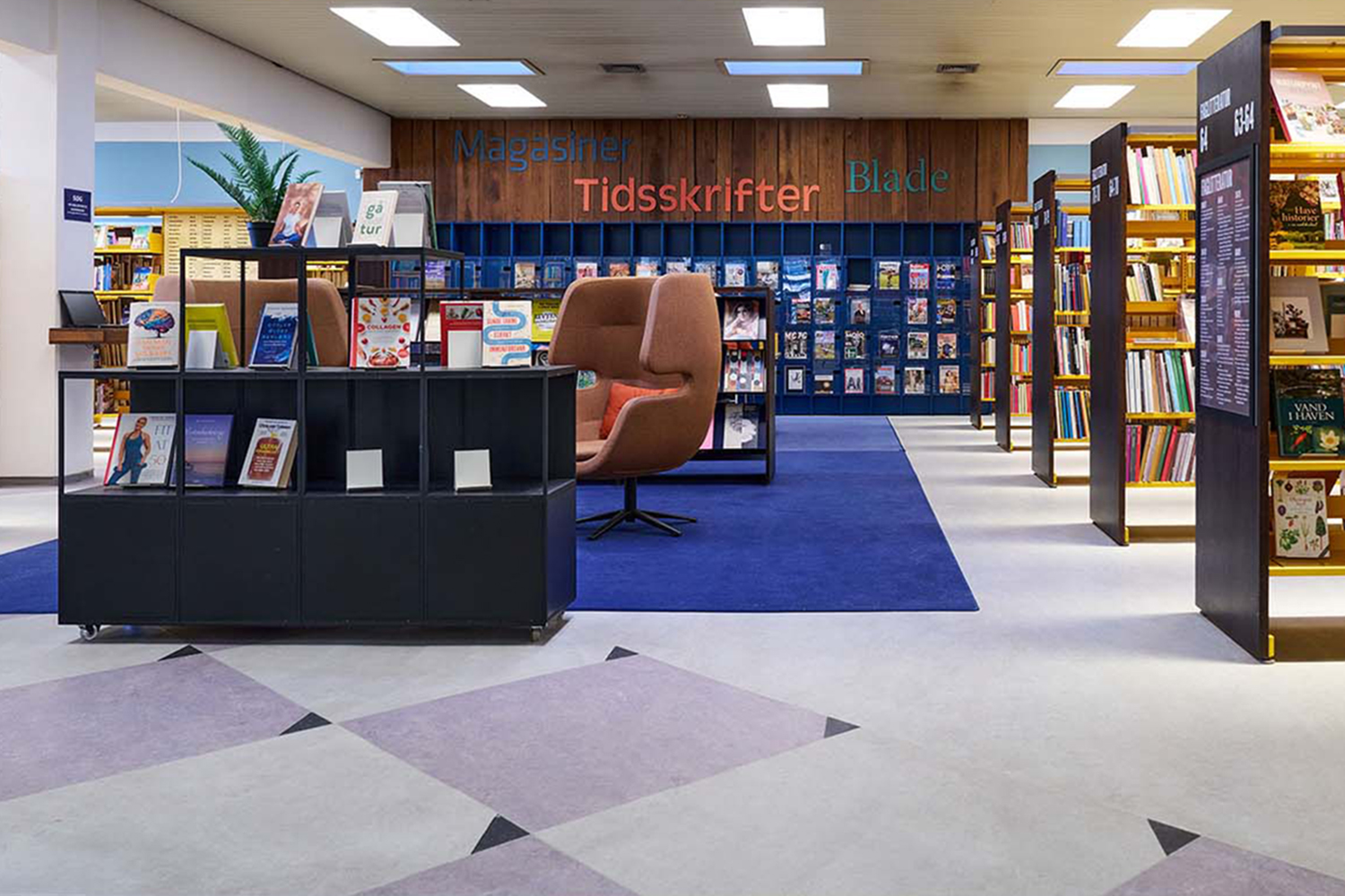 Dans le cadre de la restructuration de la bibliothèque Horsens, les anciennes étagères jaunes ont été réutilisées. Grâce à de nouveaux panneaux d’habillage d’extrémité gris anthracite, un look moderne et accueillant a été atteint. Dans le même temps, des podiums d’exposition en gris et chêne clair ont été ajoutés. Une décoration murale rappelant la forêt et un plancher en bois renforcent l’aspect « nature » des lieux. Dans l’espace jeunesse, la réalisation de jolies cabanes ont été réalisées.