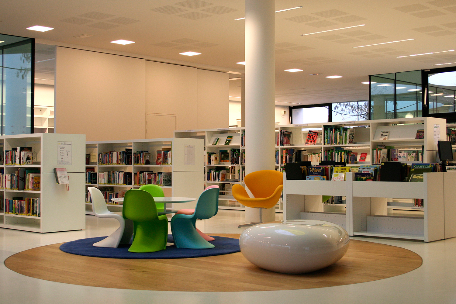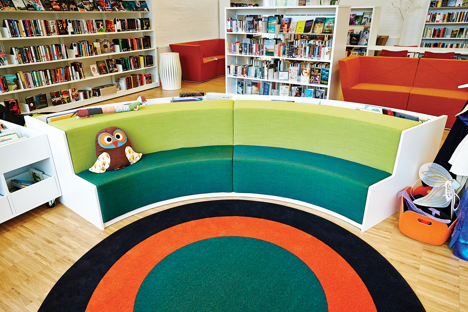 Disposer quelques sièges sur un tapis permet de créer une zone facilement sans avoir à utiliser de séparation physique. Le tapis apportera une certaine cohérence à l’espace et formera un tout avec le mobilier, empêchant donc son déplacement aux quatre coins de la bibliothèque.
