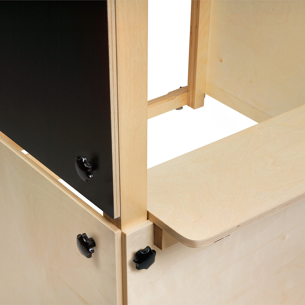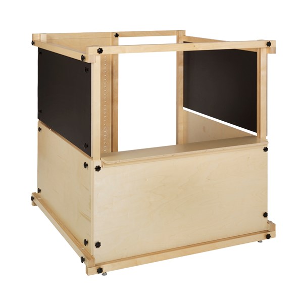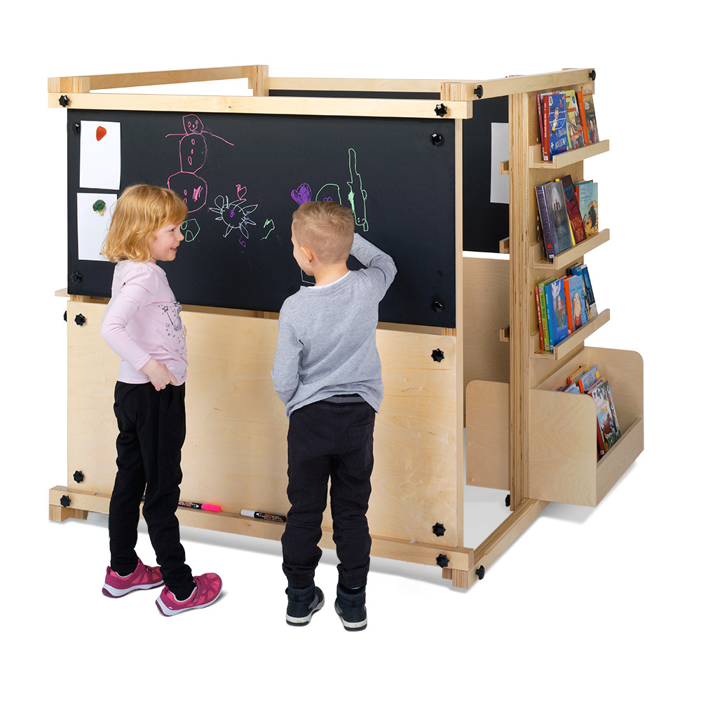Cubik est constitué d’une ossature et d’éléments muraux en contreplaqué ou en stratifié noir permettant aux enfants d’écrire/d’utiliser des accessoires aimantés.