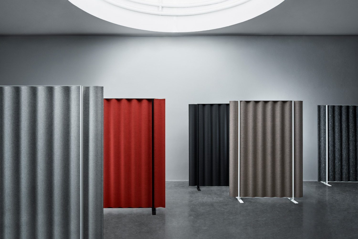 | Les cloisons, écrans de bureau et panneaux suspendus sont recouverts de textiles sur leurs deux faces. |