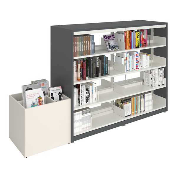 Le podium posséde un couvercle amovible et des séparations astucieuses permettant de diviser la partie supérieure en 2 à 6 compartiments, en fonction de la taille des livres.