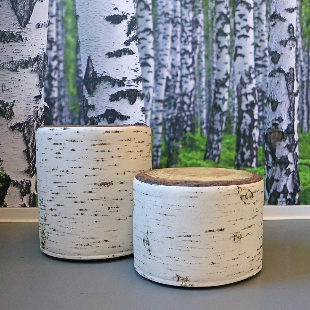La ressemblance avec une vraie souche d'arbre est saisissante. Les poufs sont confortables et stables. Ils sont disponibles en deux hauteurs pour convenir aux enfants et aux adultes. De plus, les sièges sont légers (1,5 - 1,7 kg) et empilables, ce qui en font des objets de décoration pratiques et originaux.