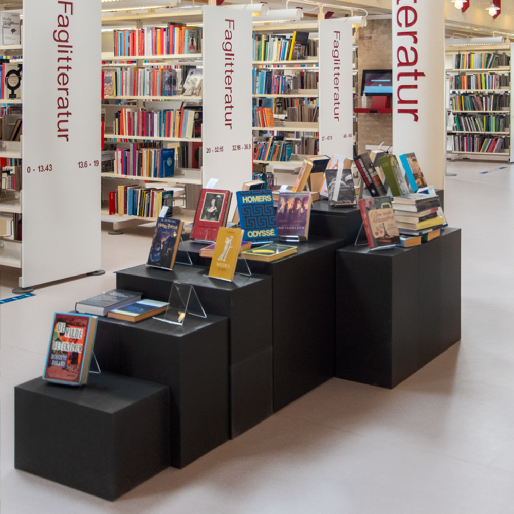 Présentoirs empilables, déclinés dans différentes hauteurs, largeurs, hauteurs et profondeurs.