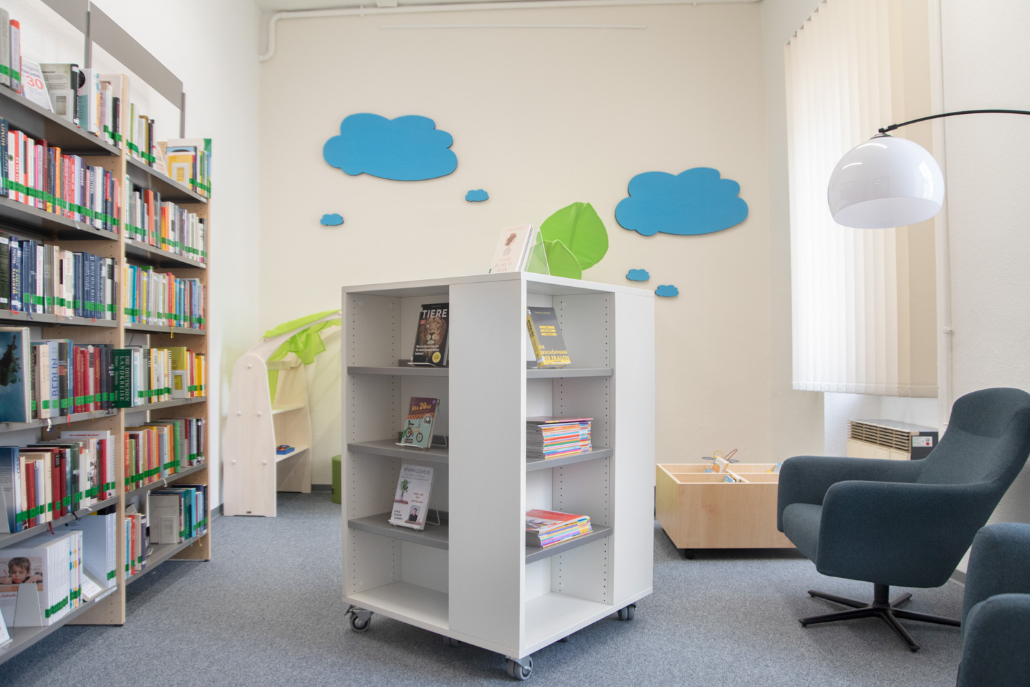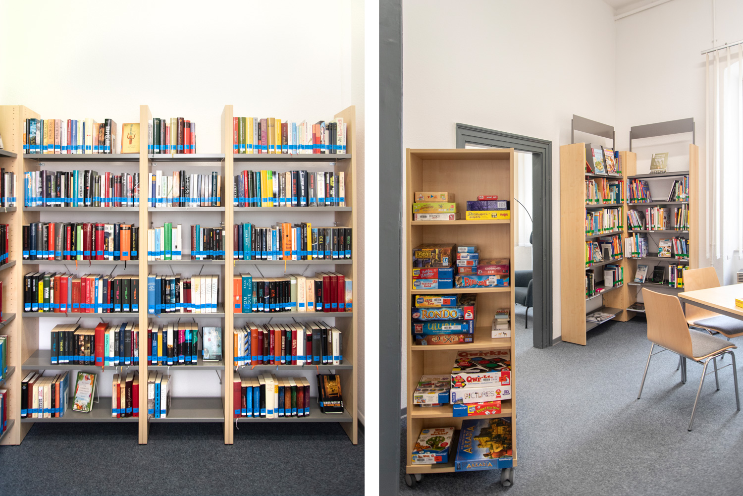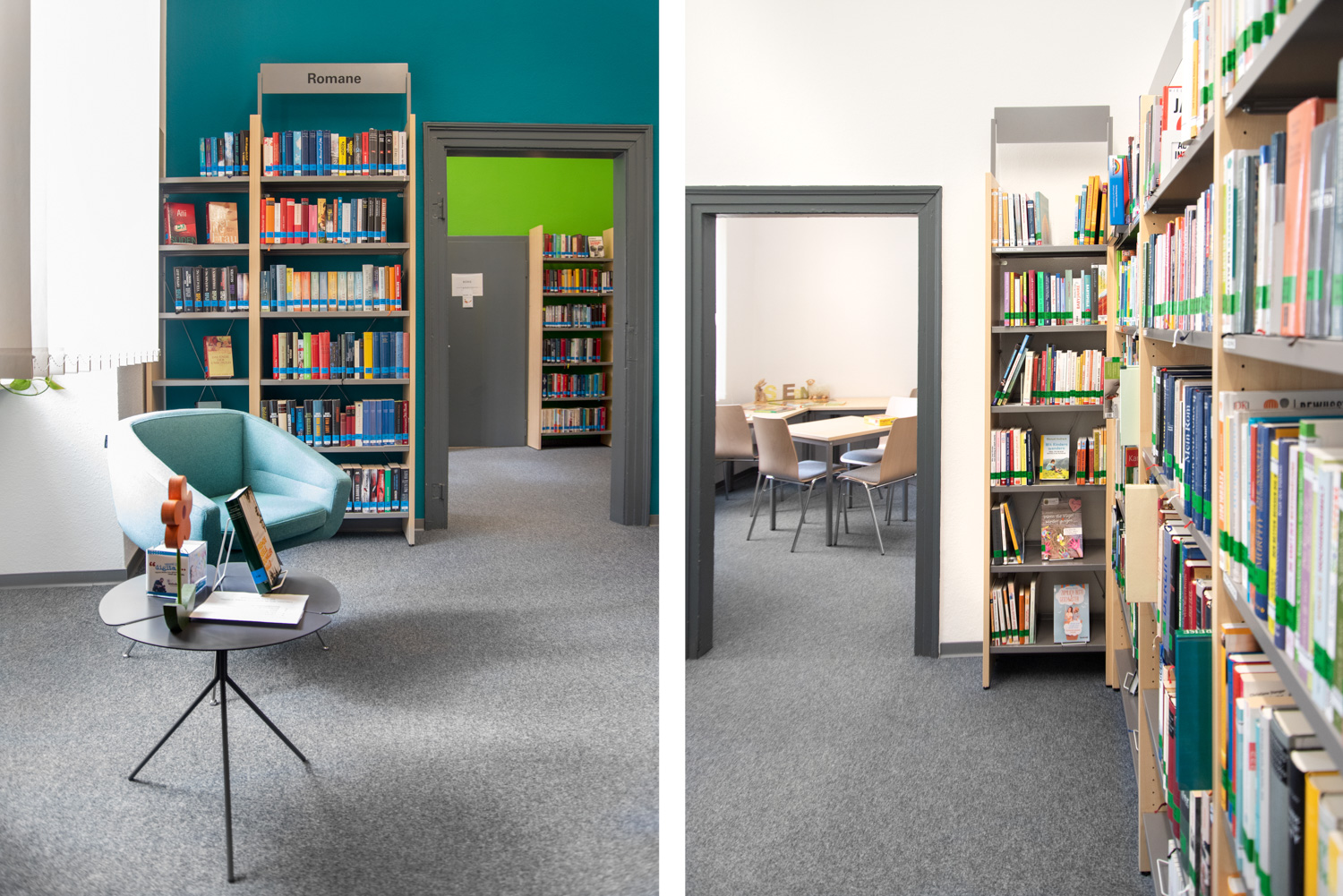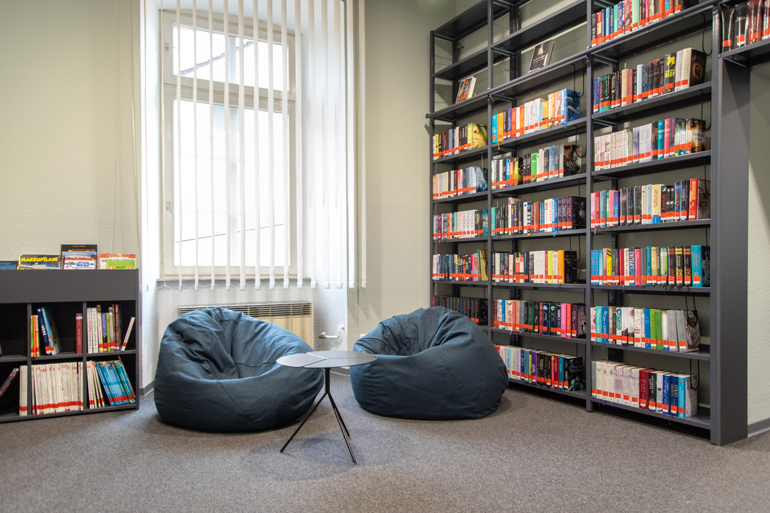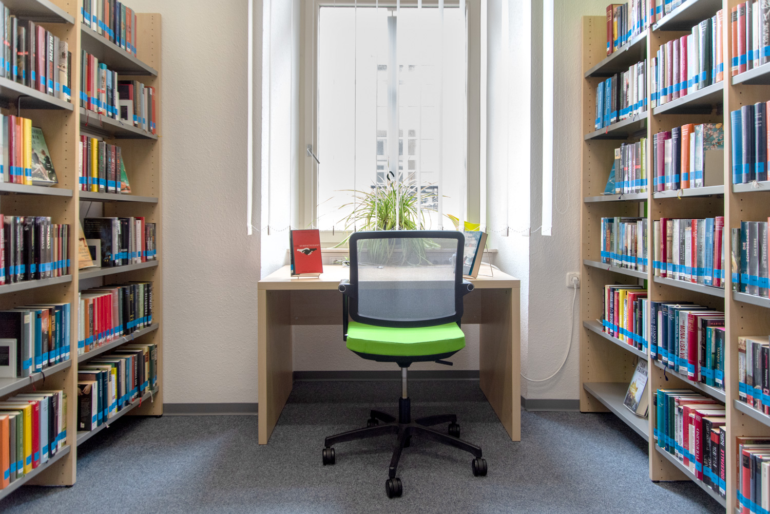 Dans un bâtiment classé monument historique et situé dans le centre d'Alzey, nous avons créé une combinaison élégante et moderne de mobilier de bibliothèque standard et de nouveaux concepts décoratifs.
