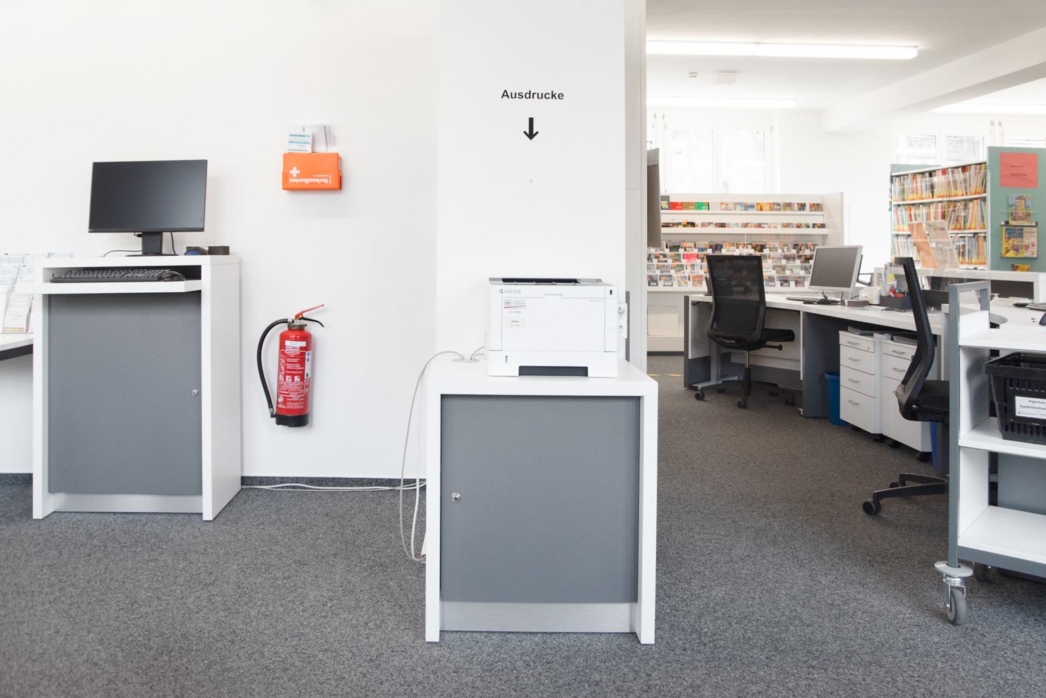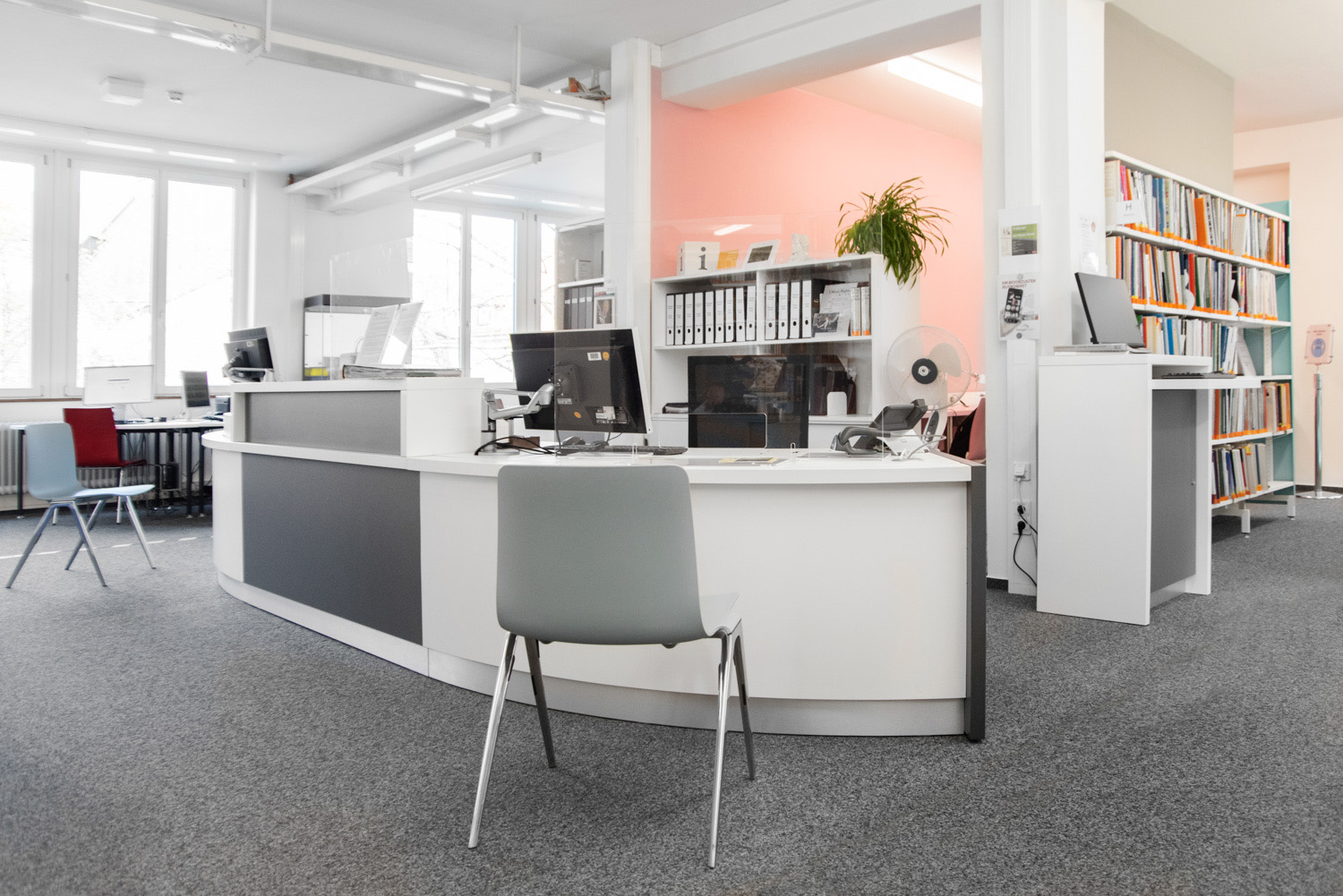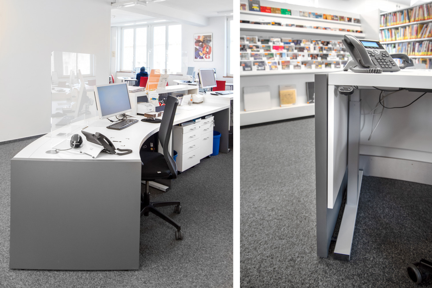 Au premier étage de la bibliothèque de Fribourg, nous avons finalisé la mise en place d'une première banque de prêt et d'accueil Inform courbe et réglable en hauteur.